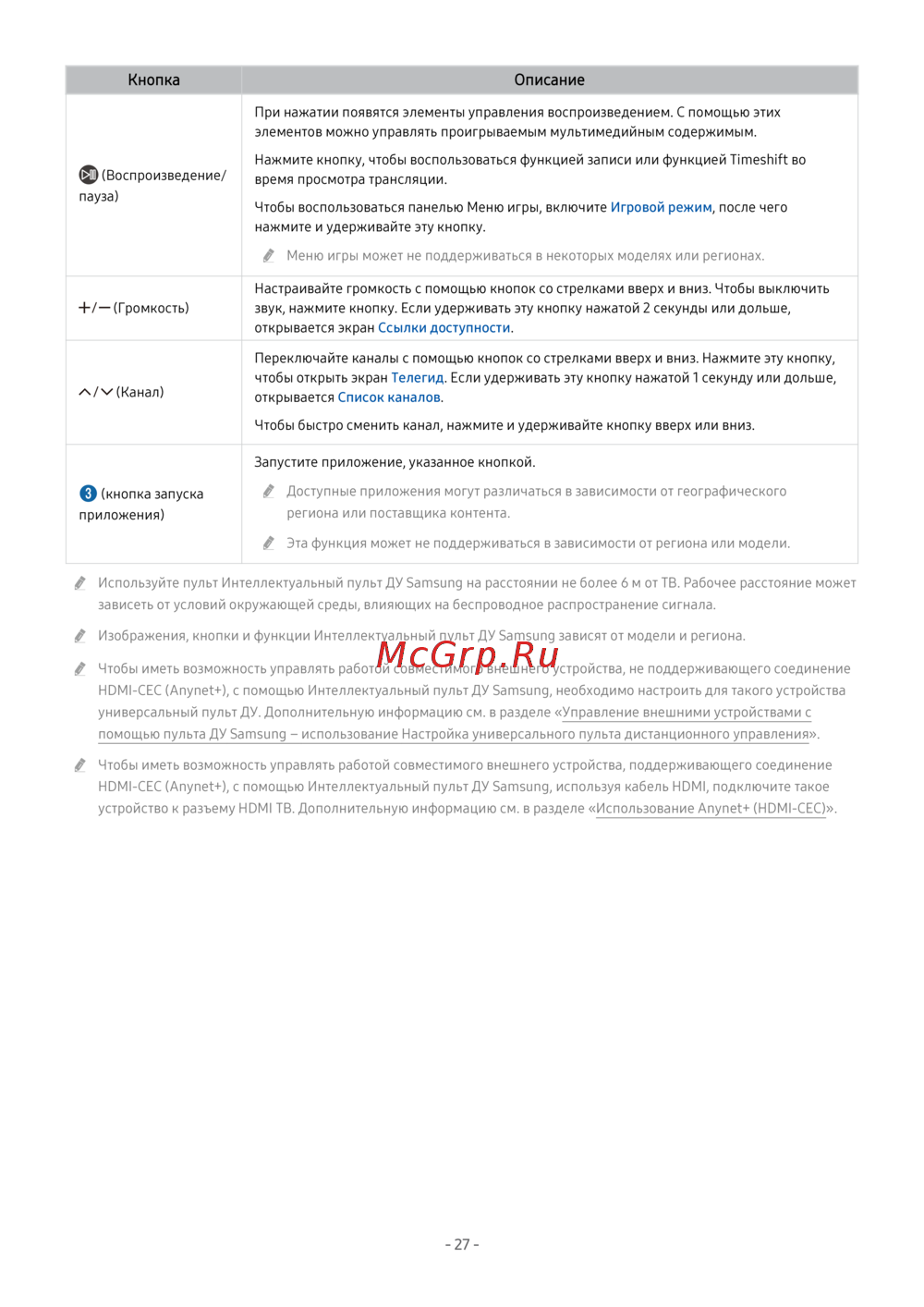 Изображения, кнопки и функции Интеллектуальный пульт ДУ Samsung зависят от модели и региона.