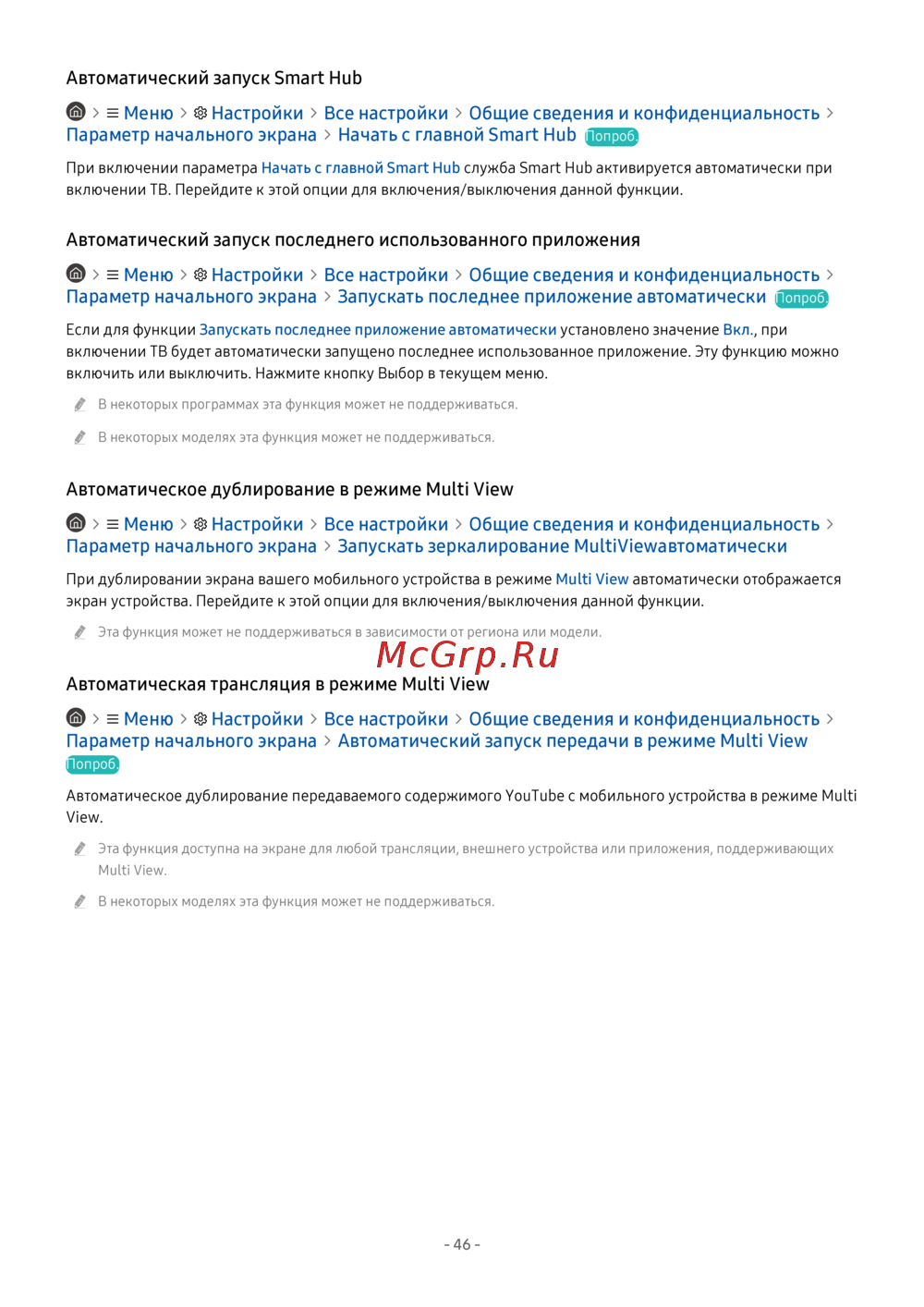Параметр начального экрана Запускать зеркалирование MultiViewавтоматически