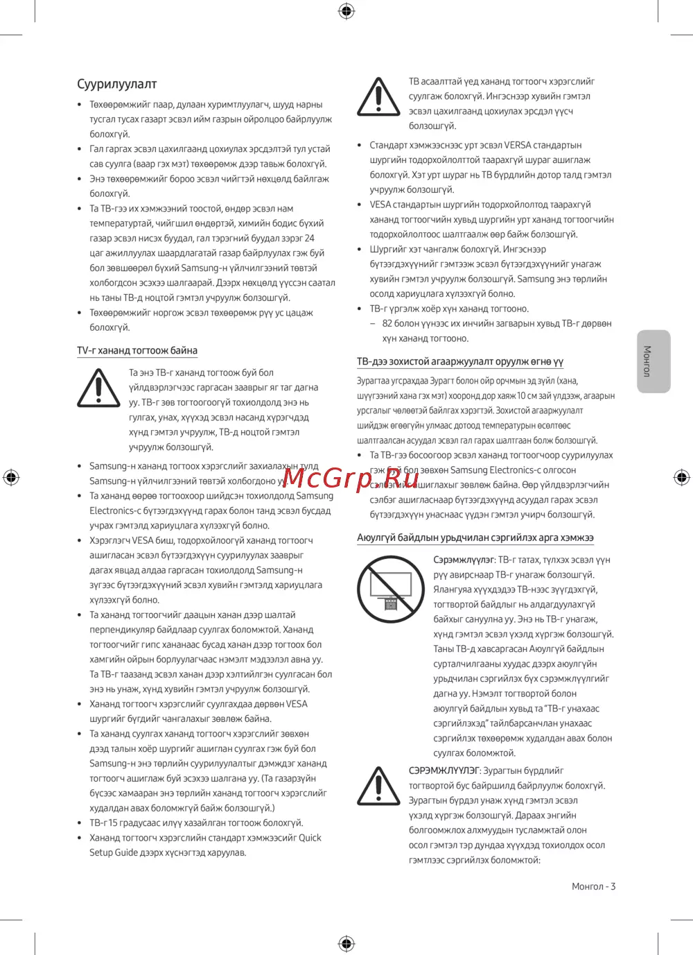 • Та ТВ-гээ босоогоор эсвэл хананд тогтоогчоор суурилуулах