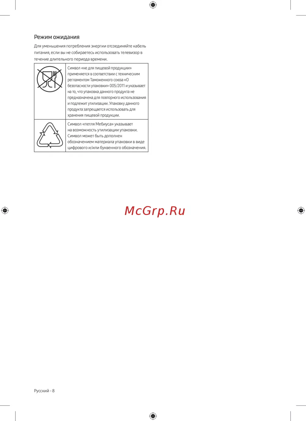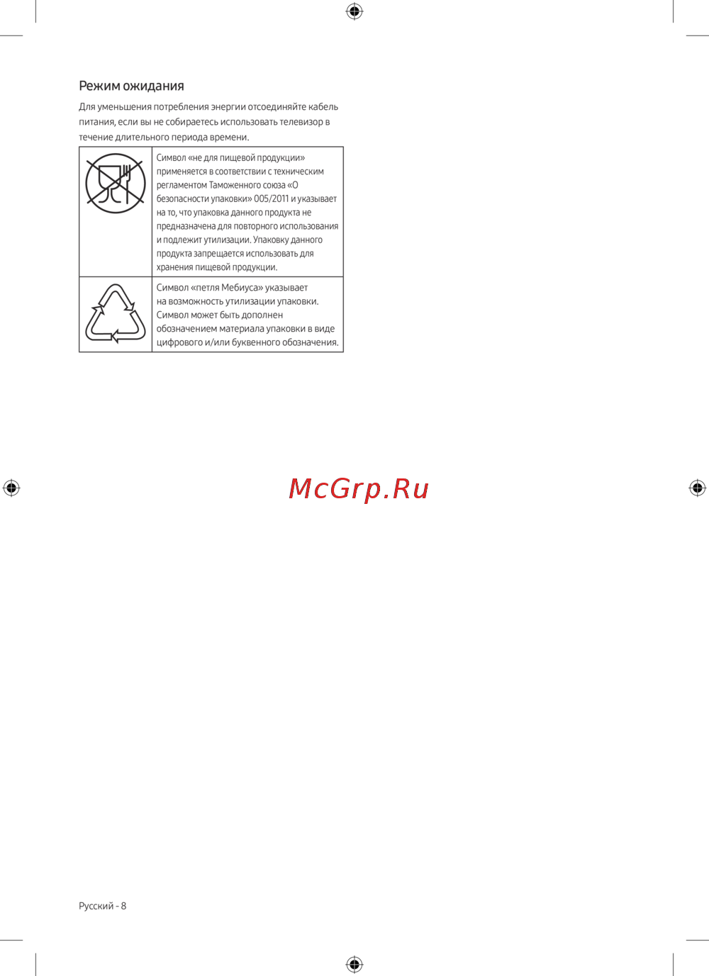 - Символ петля мебиуса указывает на возможность утилизации упаковки символ может быть дополнен обозначением материала упаковки в виде цифрового и или буквенного обозначения p.8