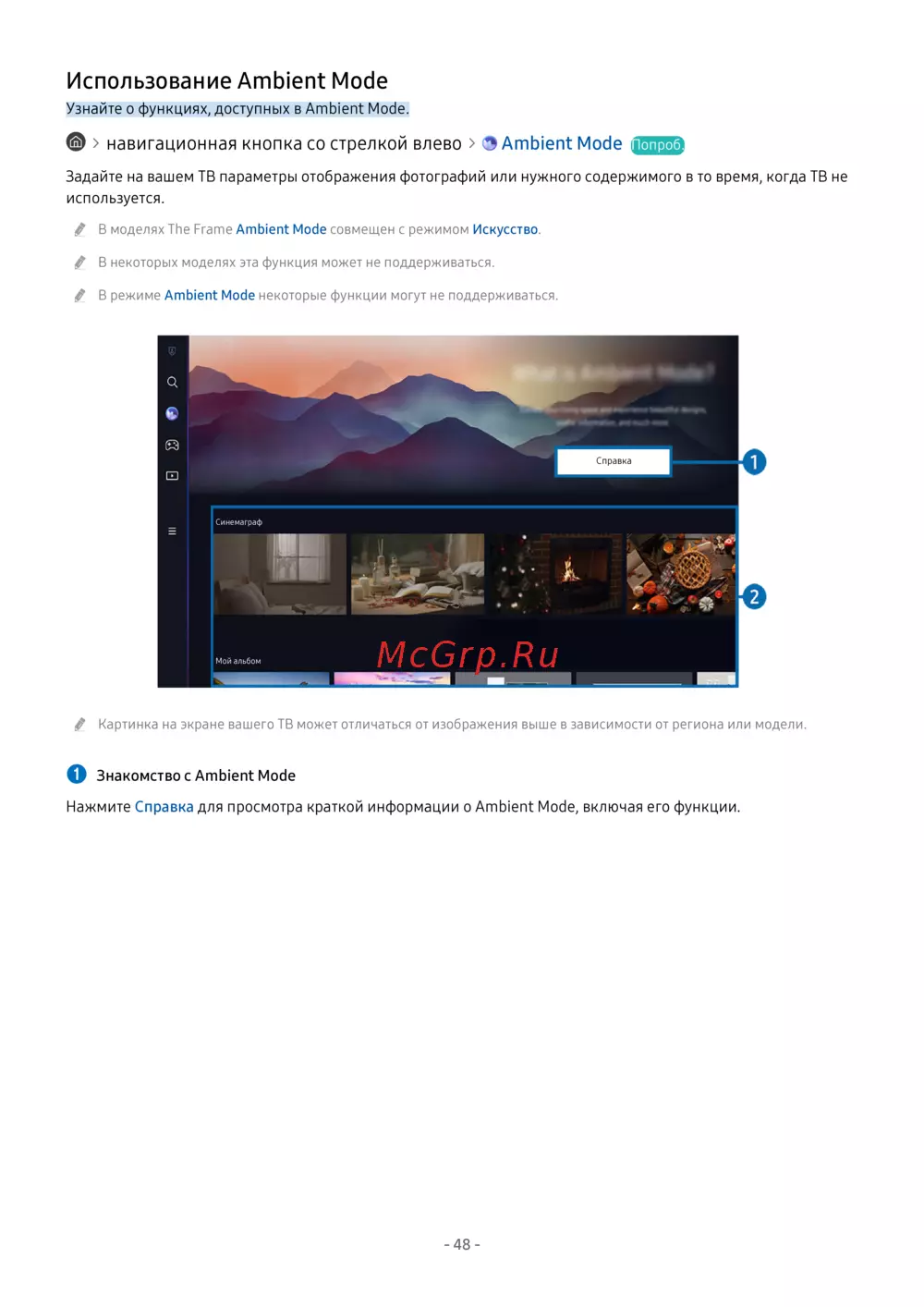 Нажмите Справка для просмотра краткой информации о Ambient Mode, включая его функции.
