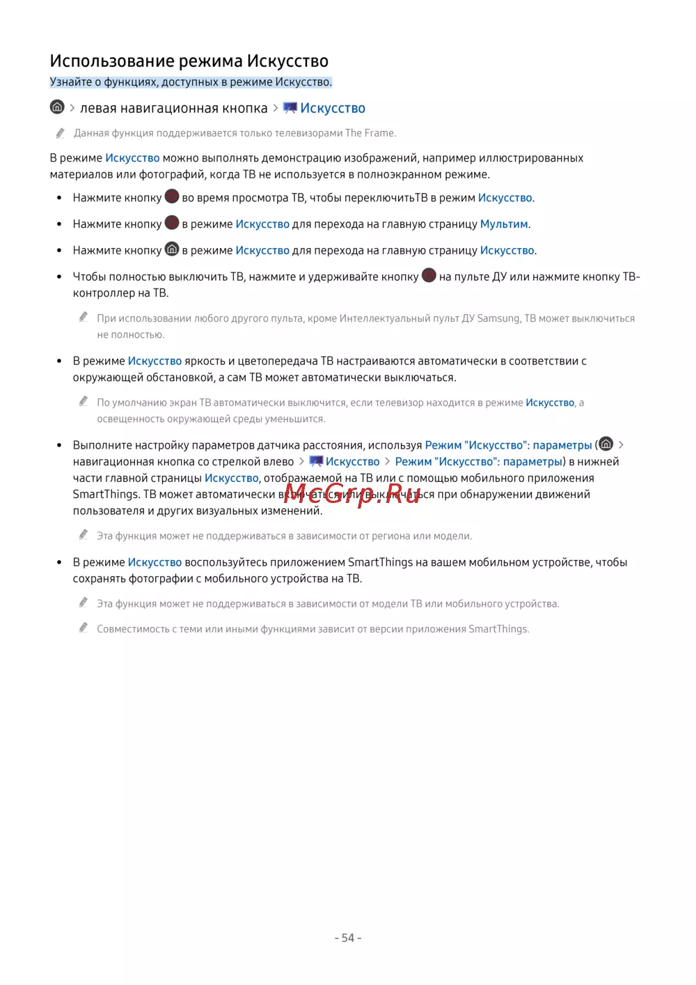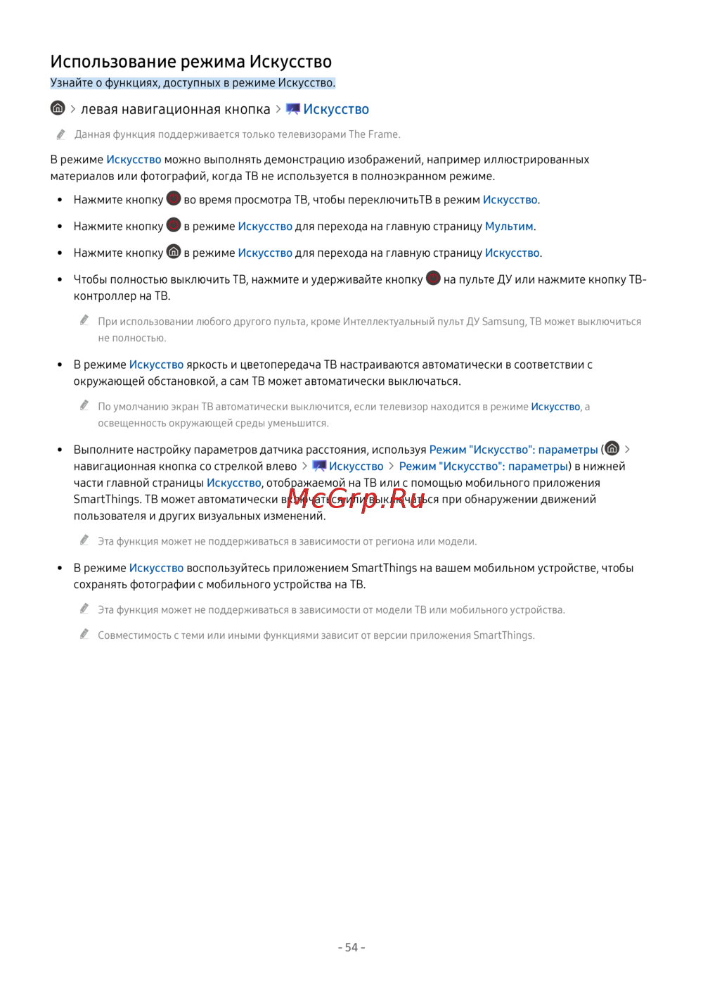 • В режиме Искусство воспользуйтесь приложением SmartThings на вашем мобильном устройстве, чтобы