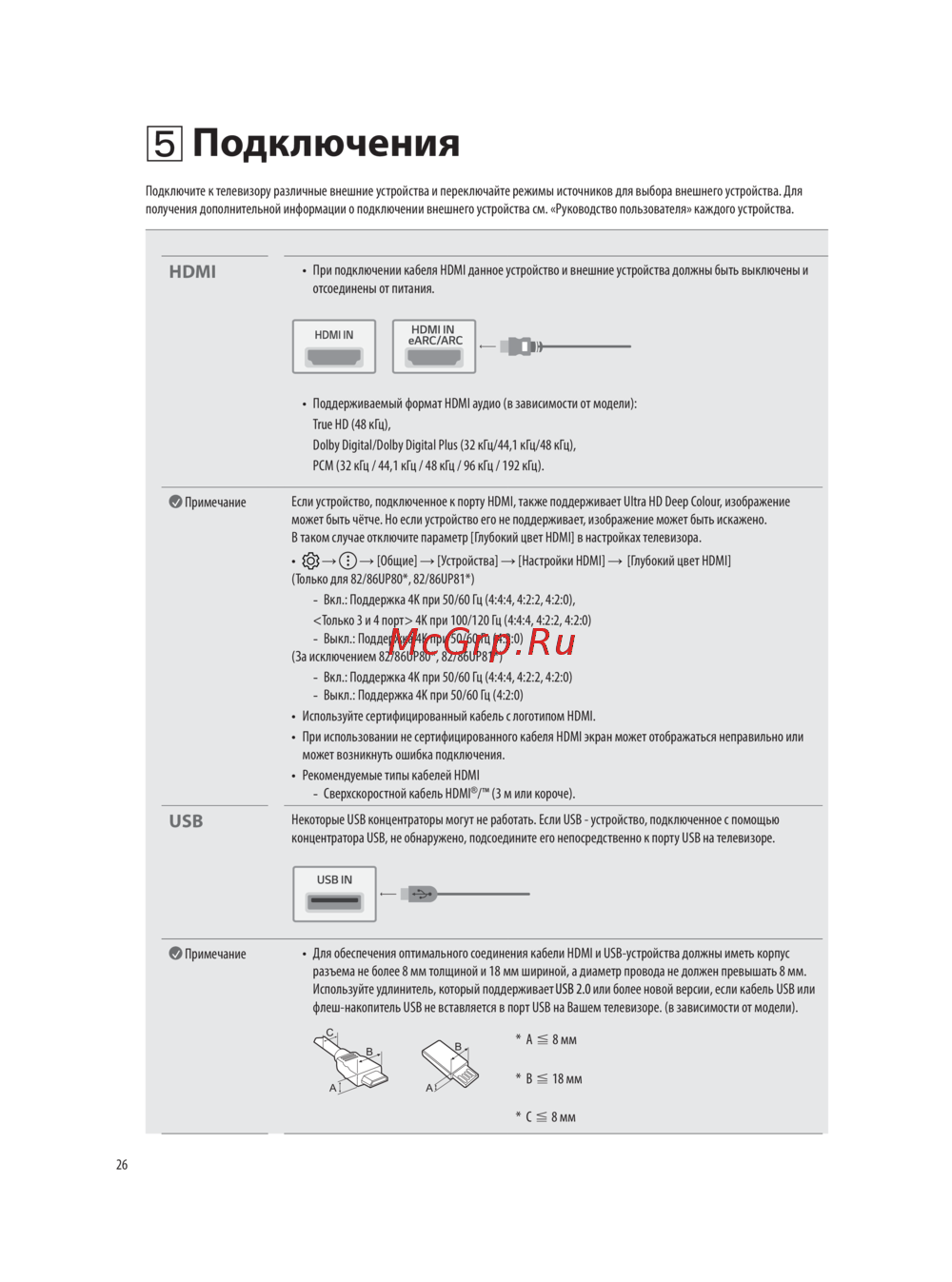 • Для обеспечения оптимального соединения кабели HDMI и USB-устройства должны иметь корпус