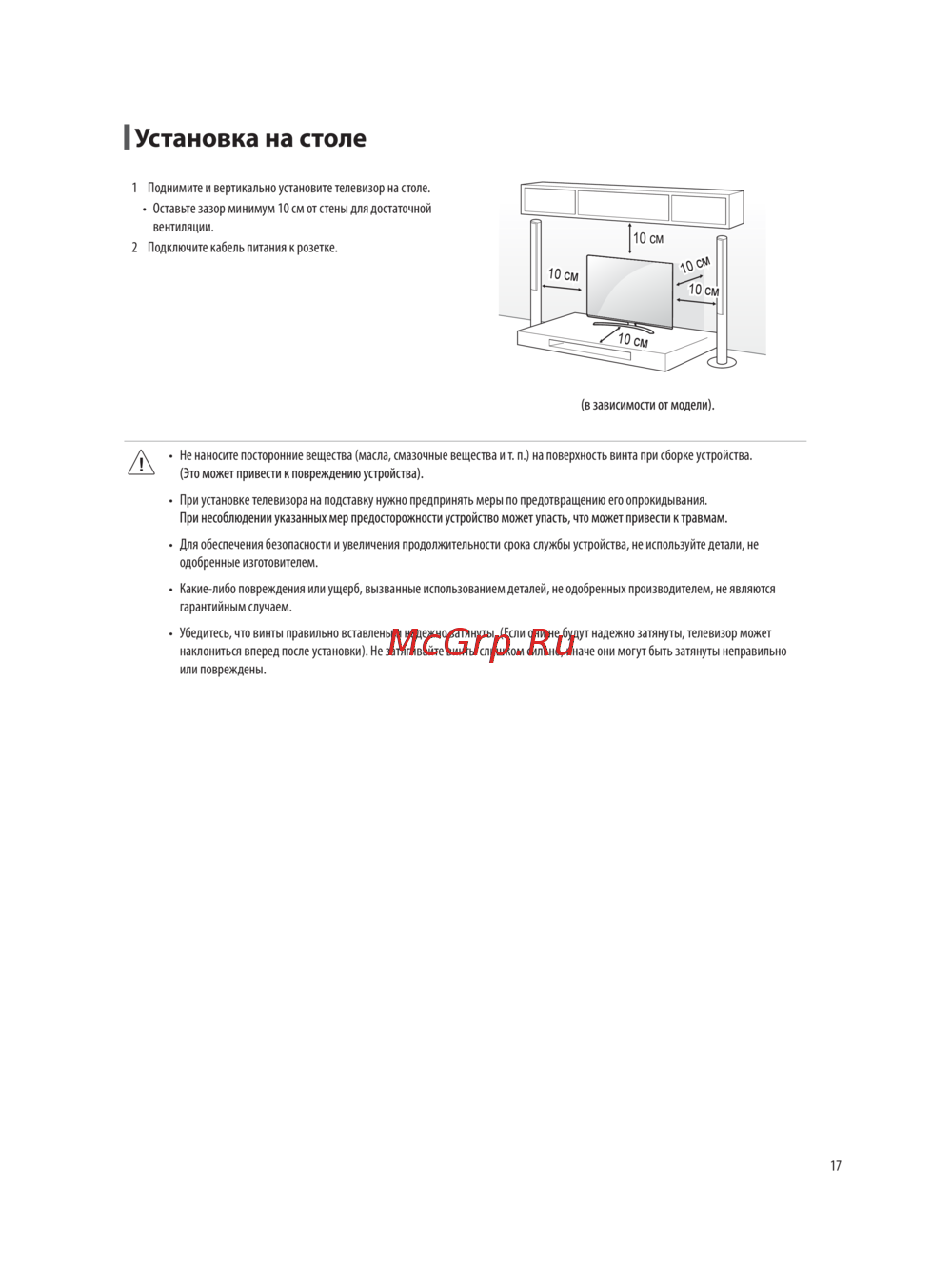 • При установке телевизора на подставку нужно предпринять меры по предотвращению его опрокидывания.