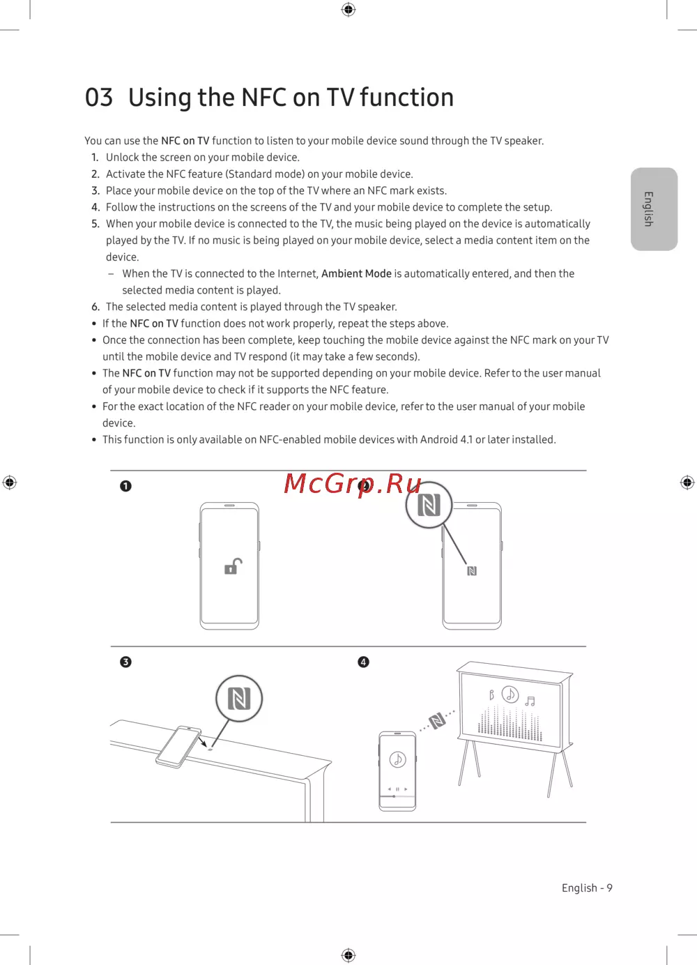 You can use the NFC on TV function to listen to your mobile device sound through the TV speaker.