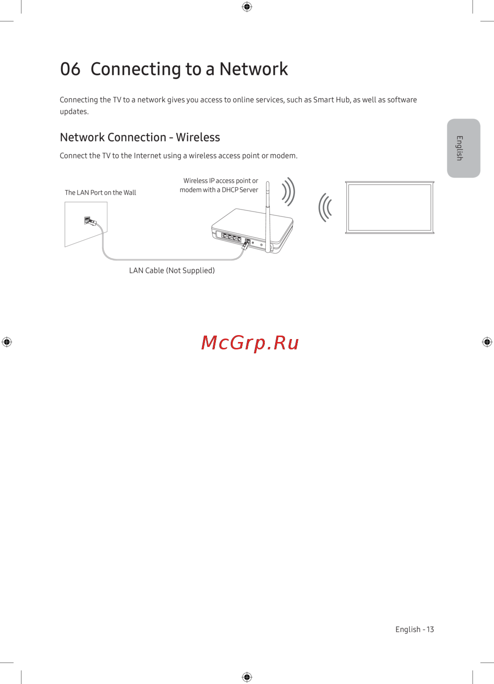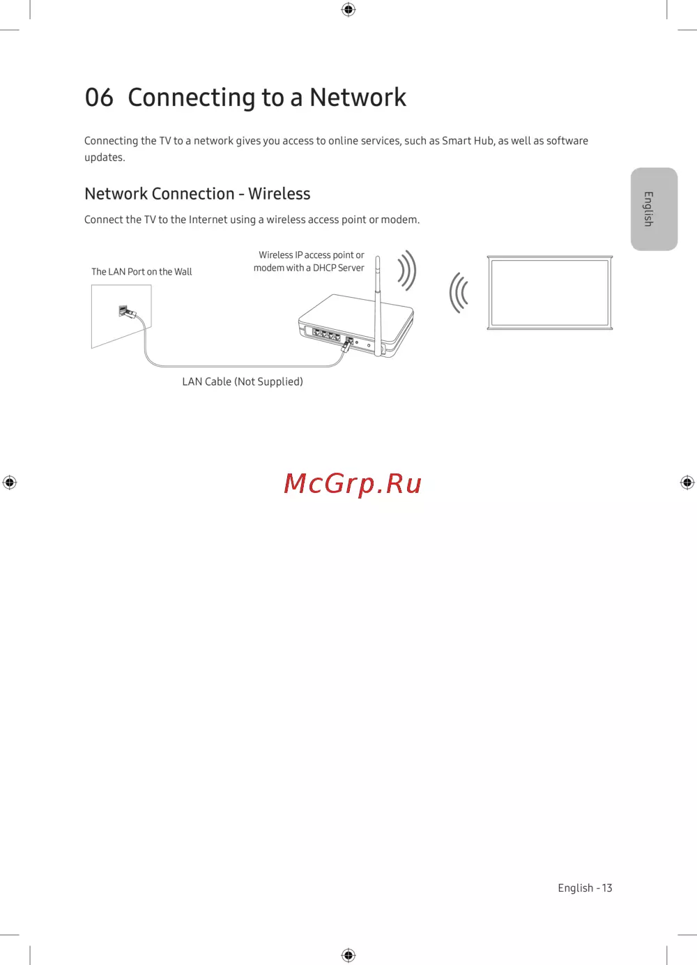 Connecting the TV to a network gives you access to online services, such as Smart Hub, as well as software