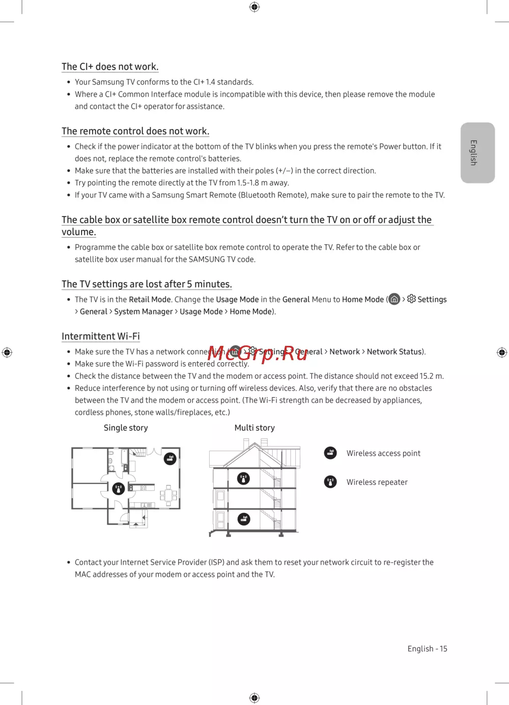 • Check the distance between the TV and the modem or access point. The distance should not exceed 15.2 m.