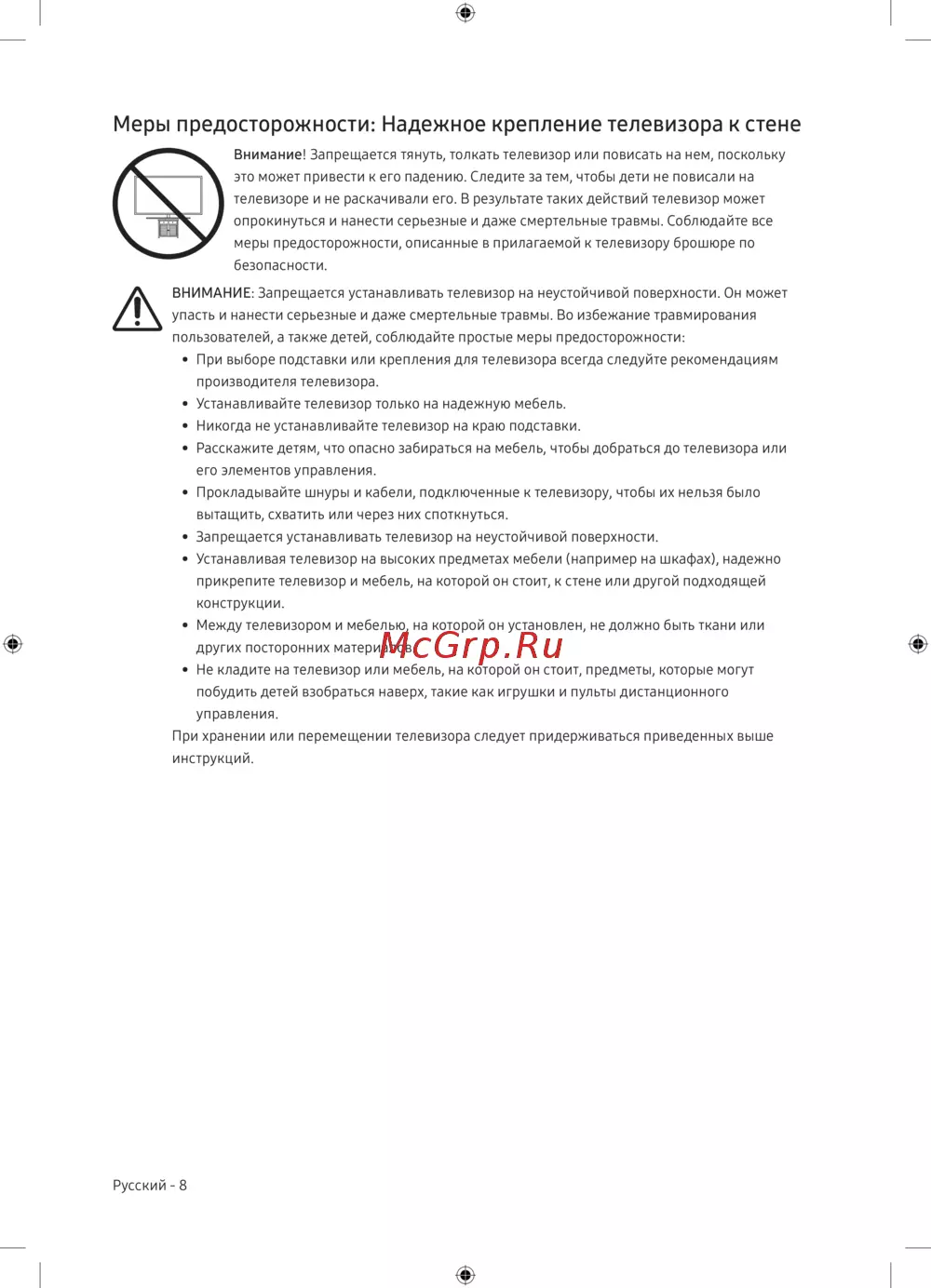 - Меры предосторожности надежное крепление телевизора к стене p.8