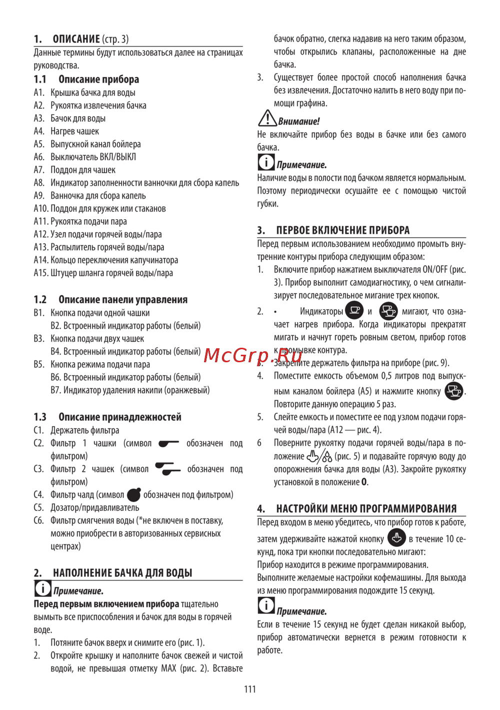 Не включайте прибор без воды в бачке или без самого