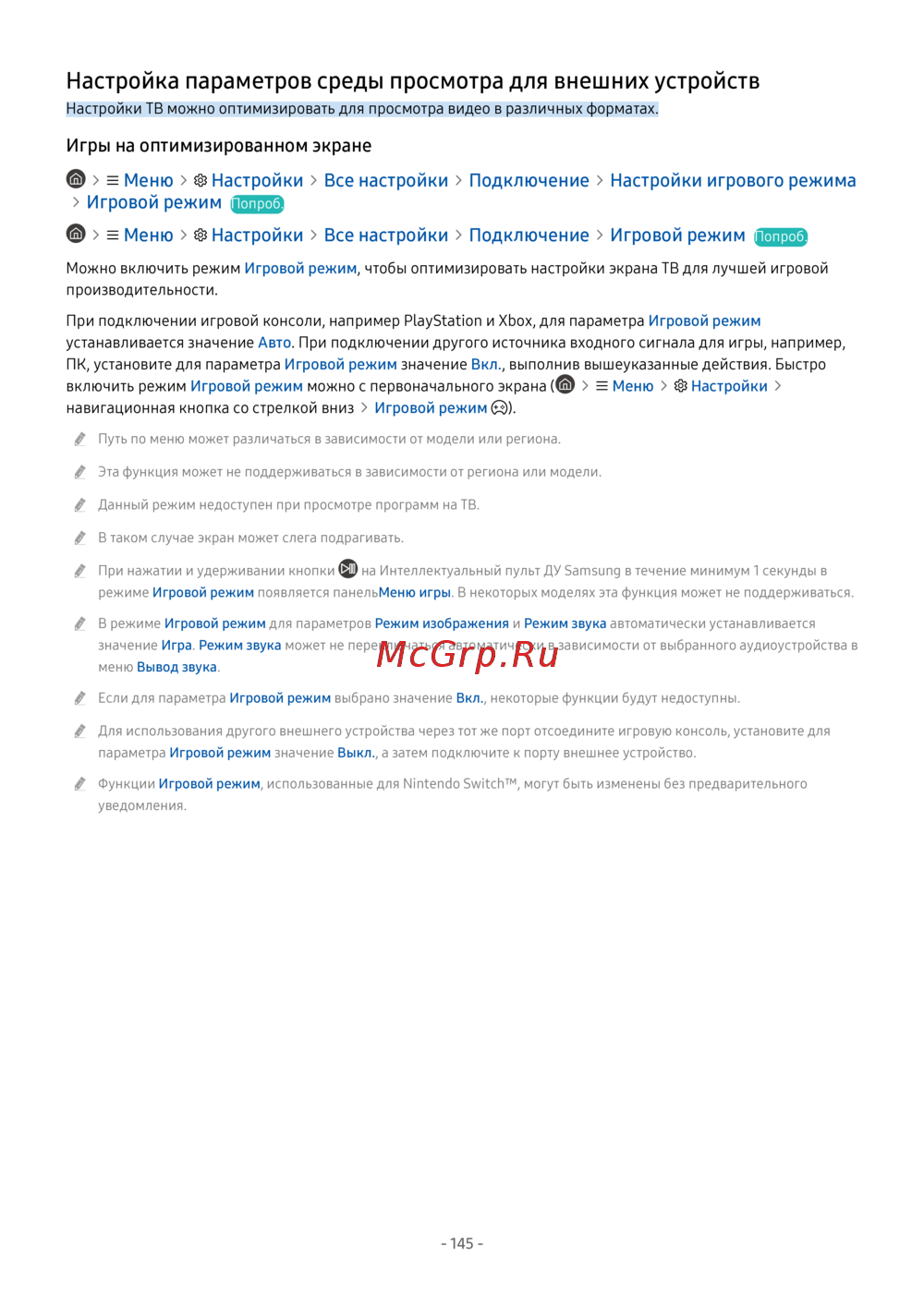 При подключении игровой консоли, например PlayStation и Xbox, для параметра Игровой режим