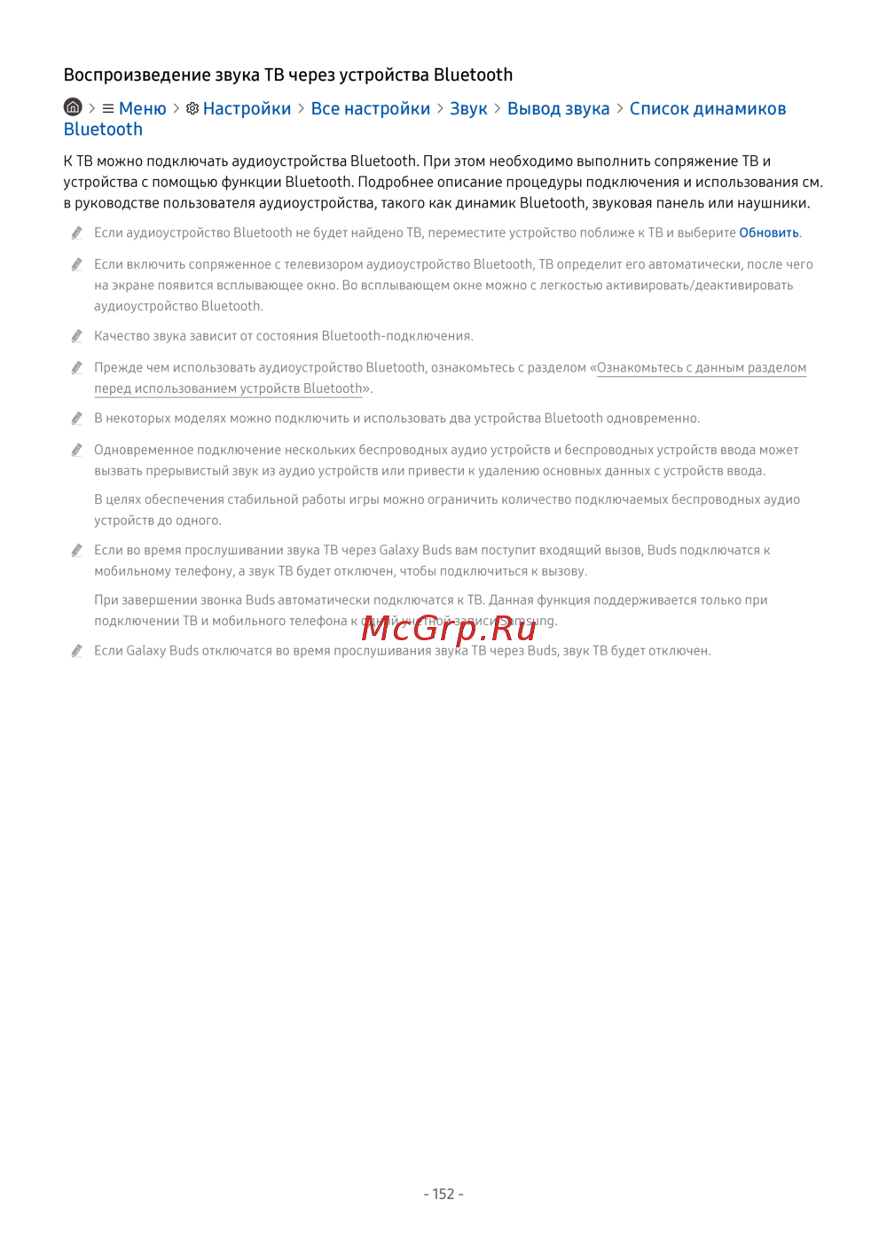 ![Samsung UE50BU8500U [152/299] К тв можно подключать аудиоустройства bluetooth при этом необходимо выполнить сопряжение тв и устройства с помощью функции bluetooth подробнее описание процедуры подключения и использования см в руководстве пользователя аудиоустройства такого как динамик bluetooth звуковая панель или наушники](/views2/1979196/page152/bg98.png)