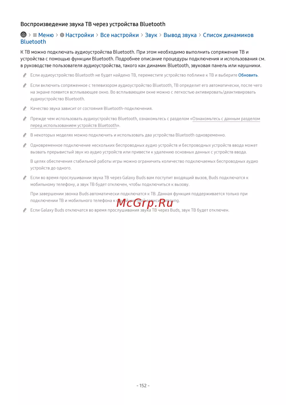 Если Galaxy Buds отключатся во время прослушивания звука ТВ через Buds, звук ТВ будет отключен.
