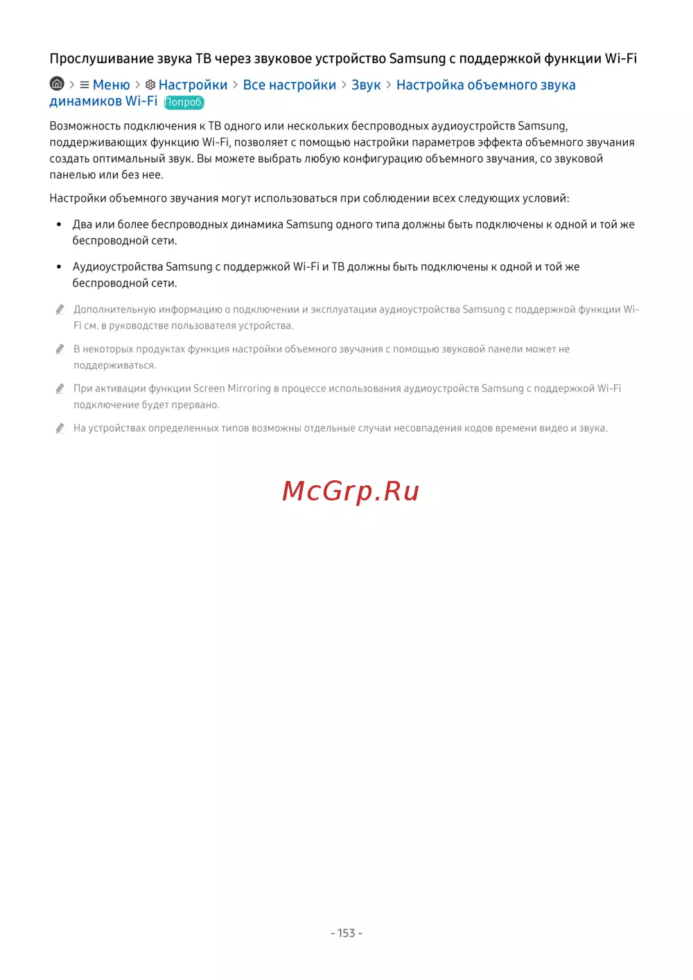• Аудиоустройства Samsung с поддержкой Wi-Fi и ТВ должны быть подключены к одной и той же