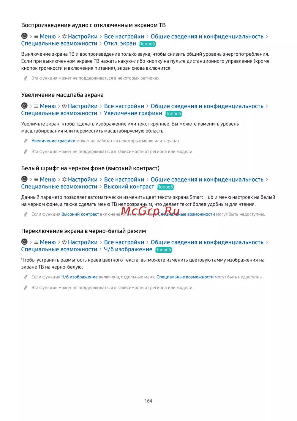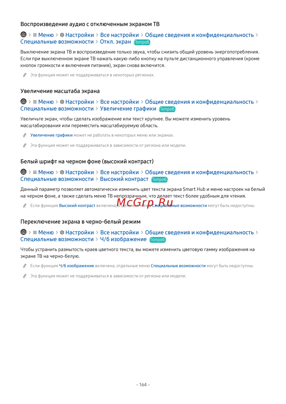 Если функция Ч/б изображение включена, отдельные меню Специальные возможности могут быть недоступны.