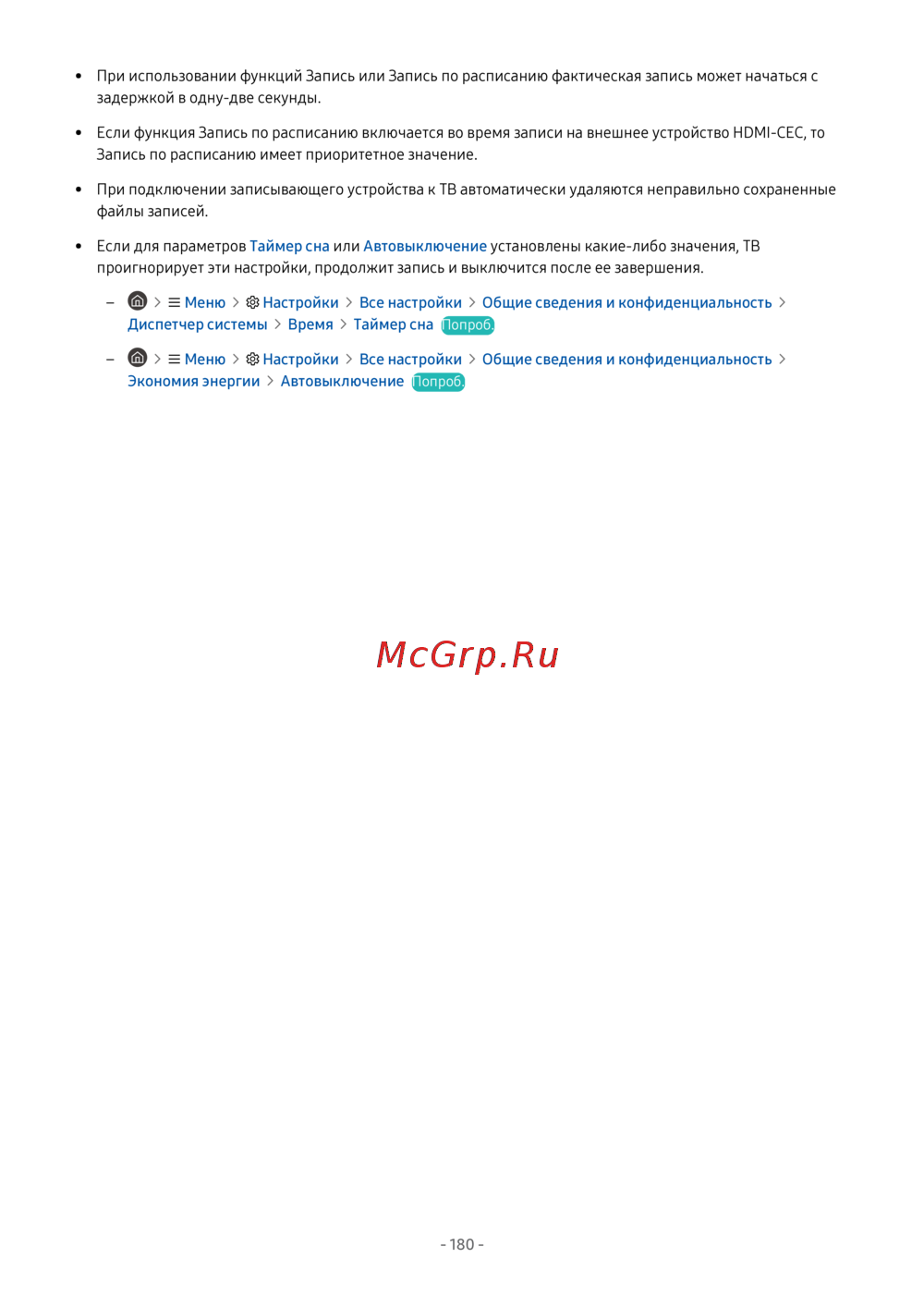 • Если для параметров Таймер сна или Автовыключение установлены какие-либо значения, ТВ