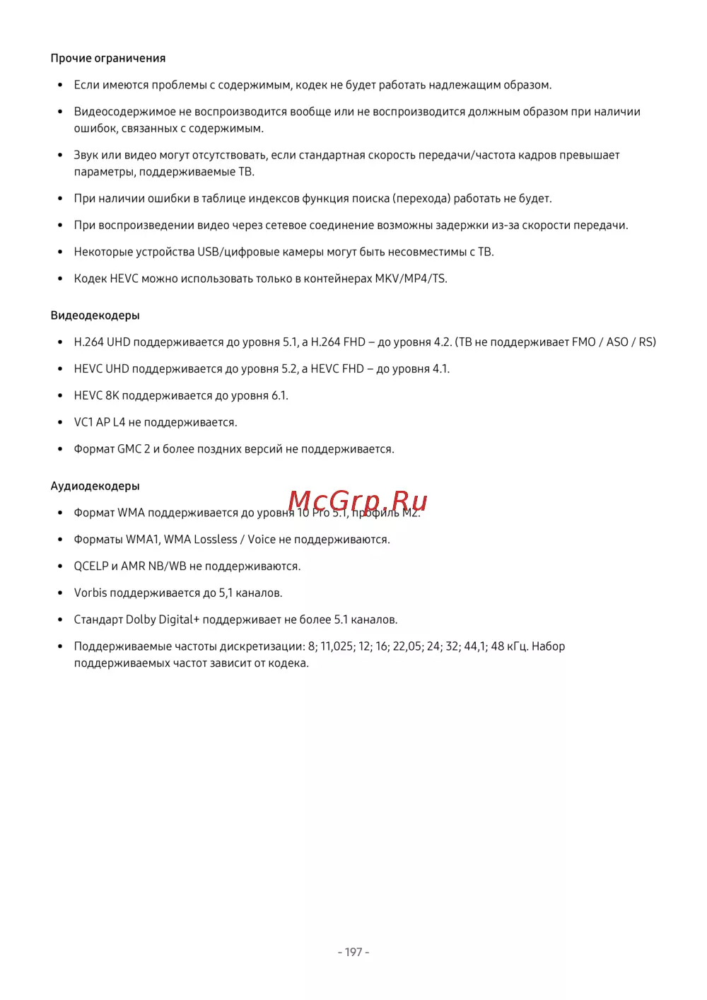 • H.264 UHD поддерживается до уровня 5.1, а H.264 FHD – до уровня 4.2. (ТВ не поддерживает FMO / ASO / RS)