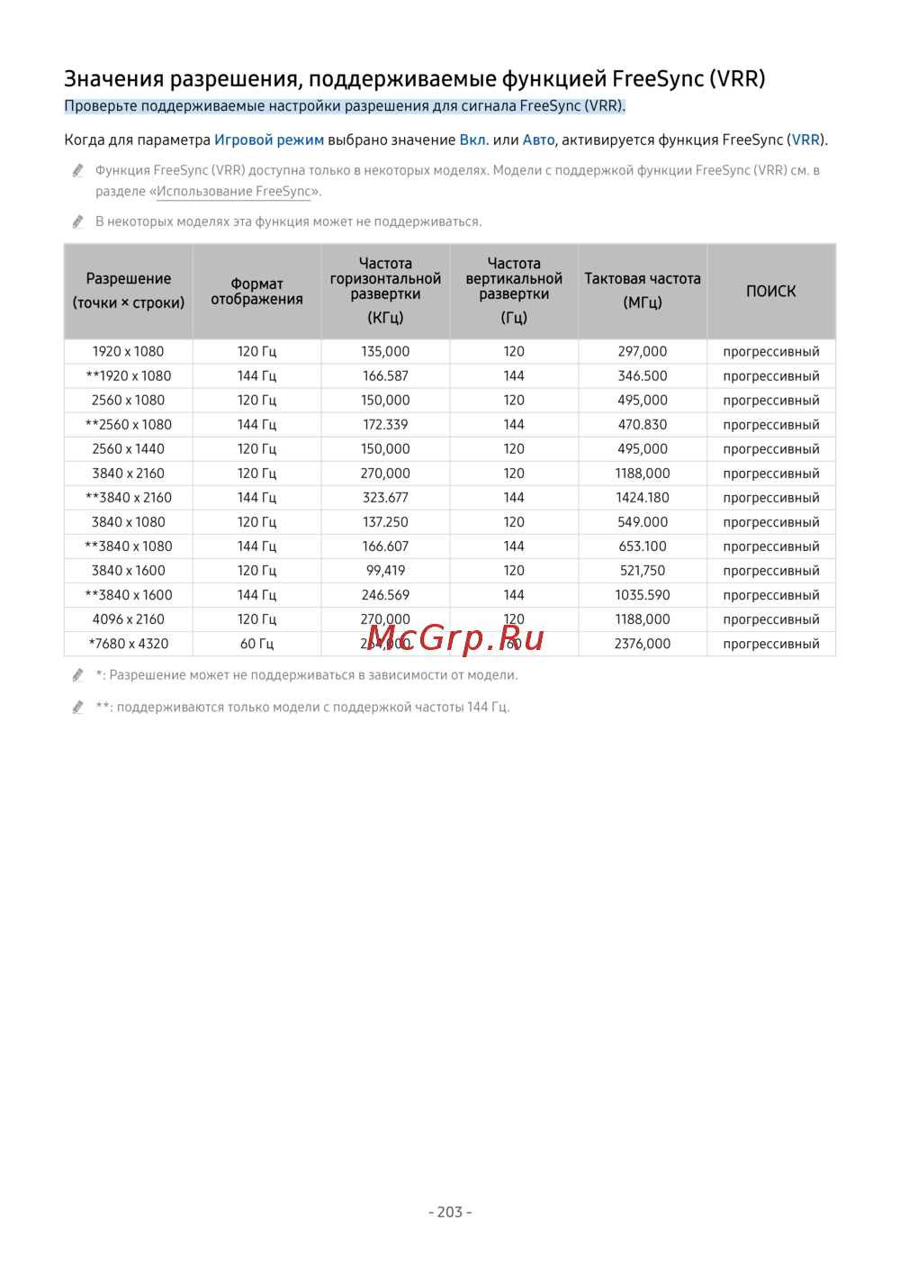 Значения разрешения, поддерживаемые функцией FreeSync (VRR)
