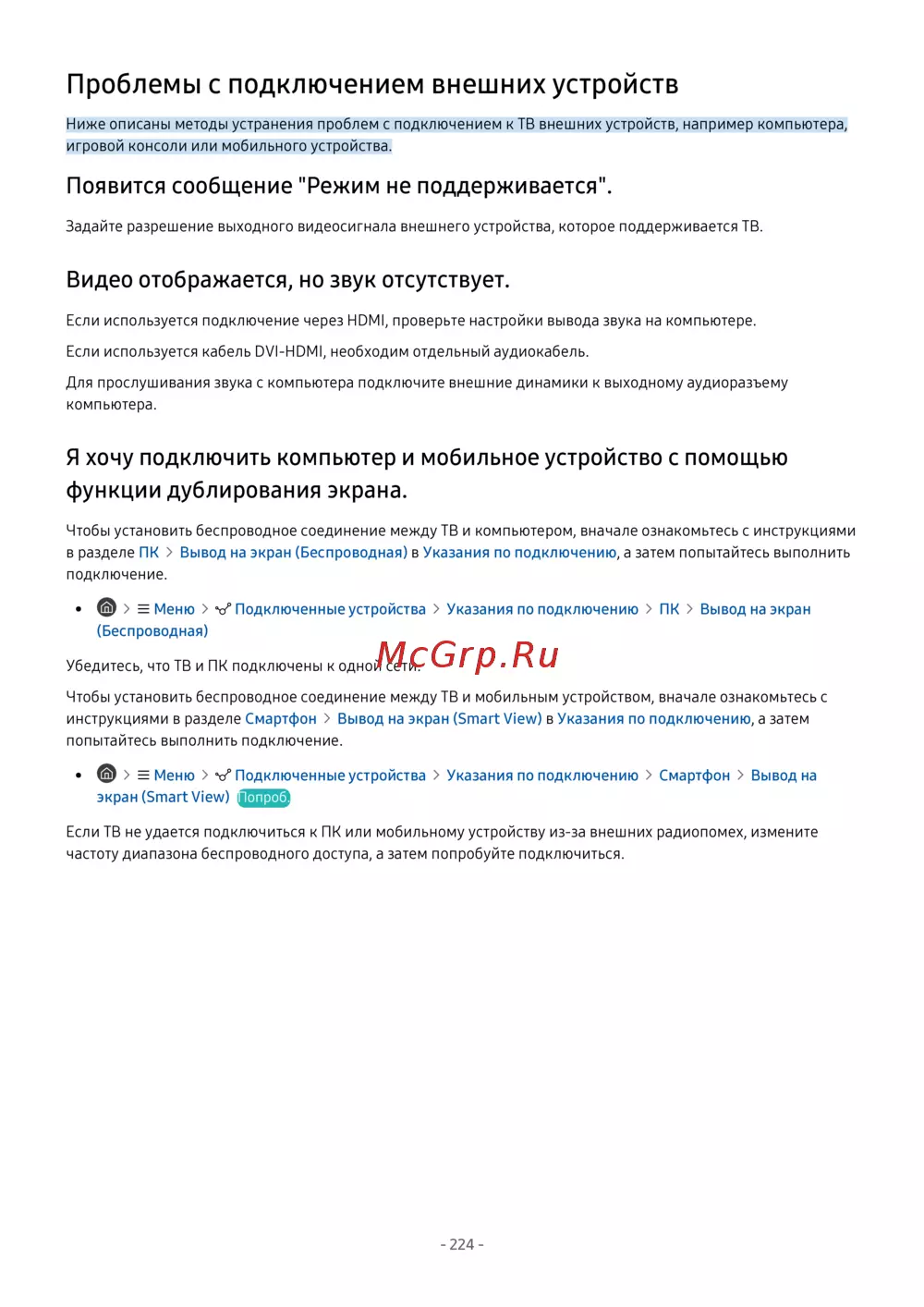 - Если проблема не исчезает попробуйте подключить к тв другое устройство с помощью кабеля hdmi если изображение на экране нормальное неисправность связана с внешним устройством p.251