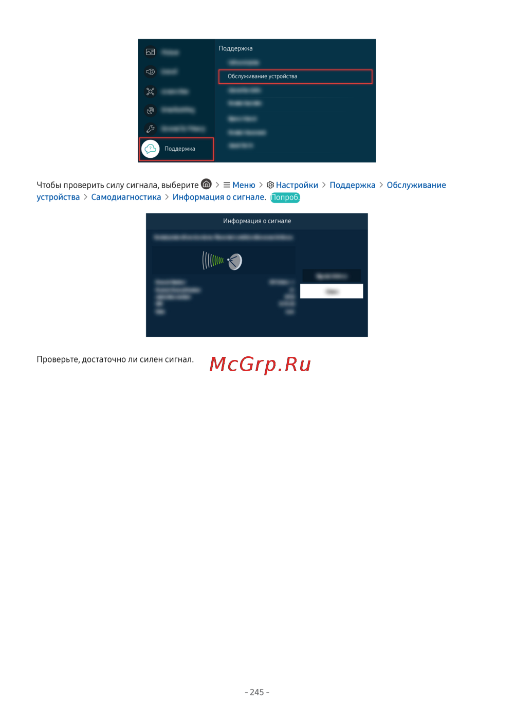 Чтобы проверить силу сигнала, выберите Меню Настройки Поддержка Обслуживание