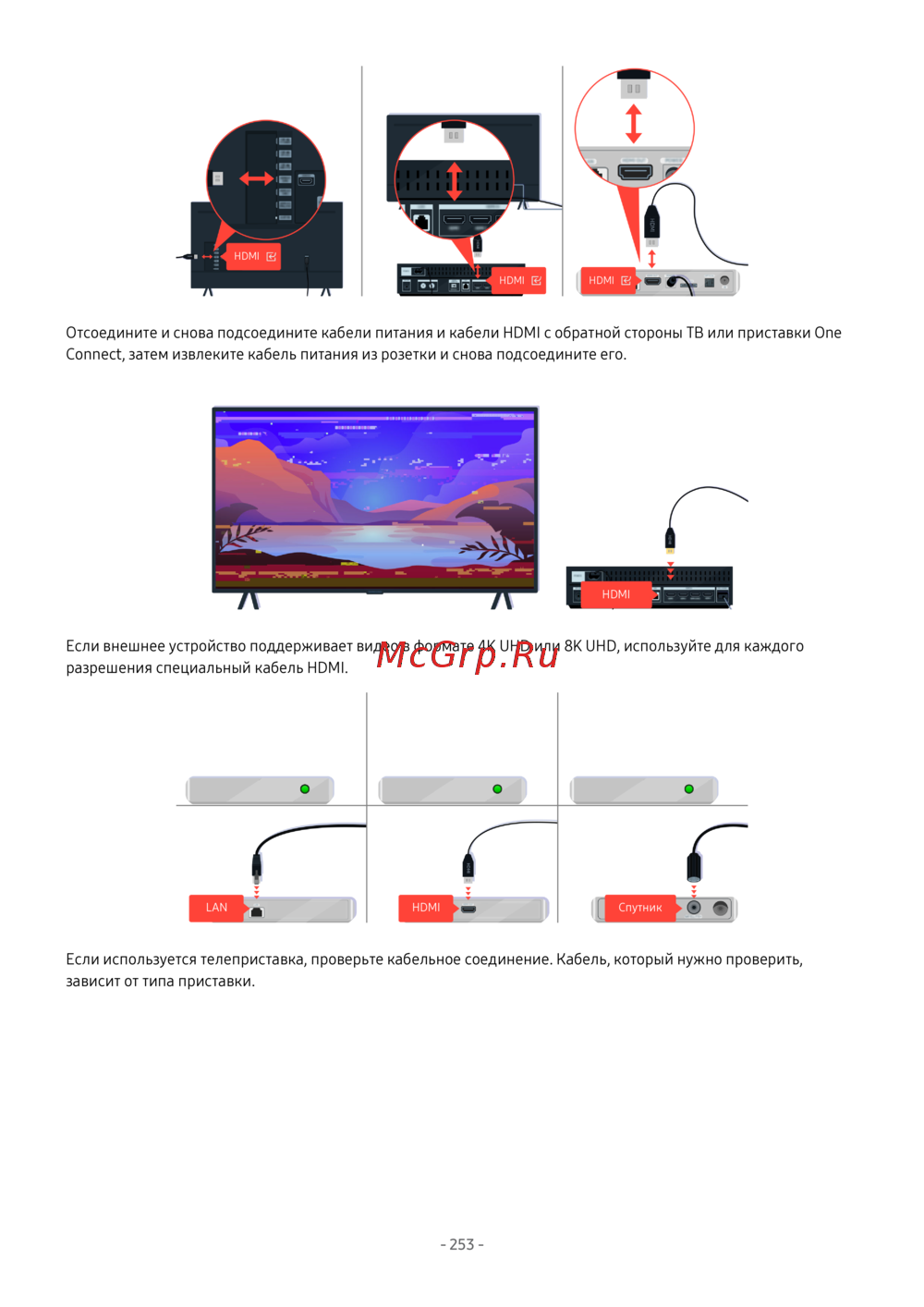 - Если проблема не исчезает попробуйте подключить к тв другое устройство с помощью кабеля hdmi если изображение на экране нормальное неисправность связана с внешним устройством p.251