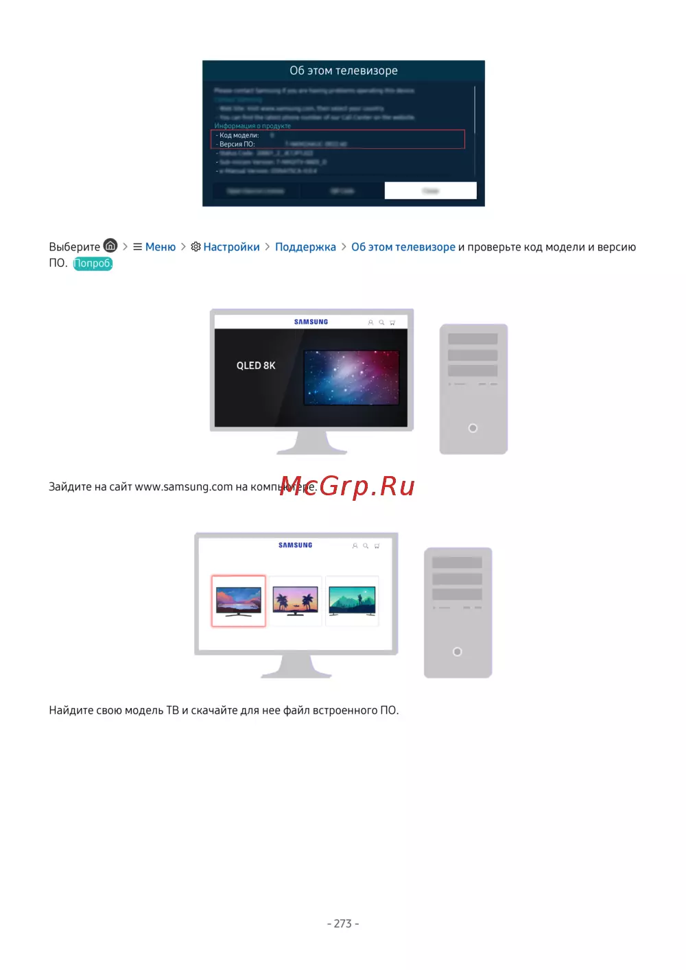 Выберите Меню Настройки Поддержка Об этом телевизоре и проверьте код модели и версию