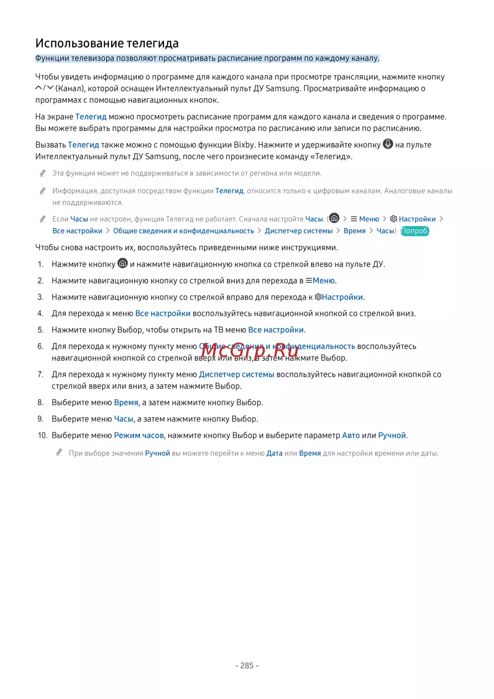 Если Часы не настроен, функция Телегид не работает. Сначала настройте Часы. ( Меню Настройки