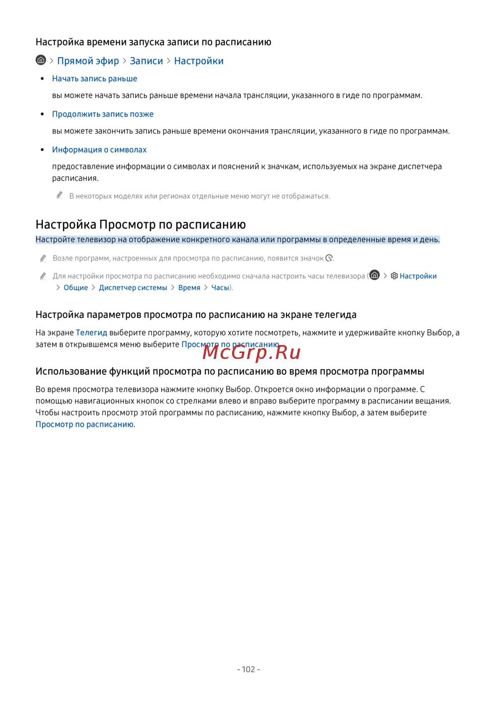 - Использование функций моментальной записи и записи по расписанию на экране телегида p.256