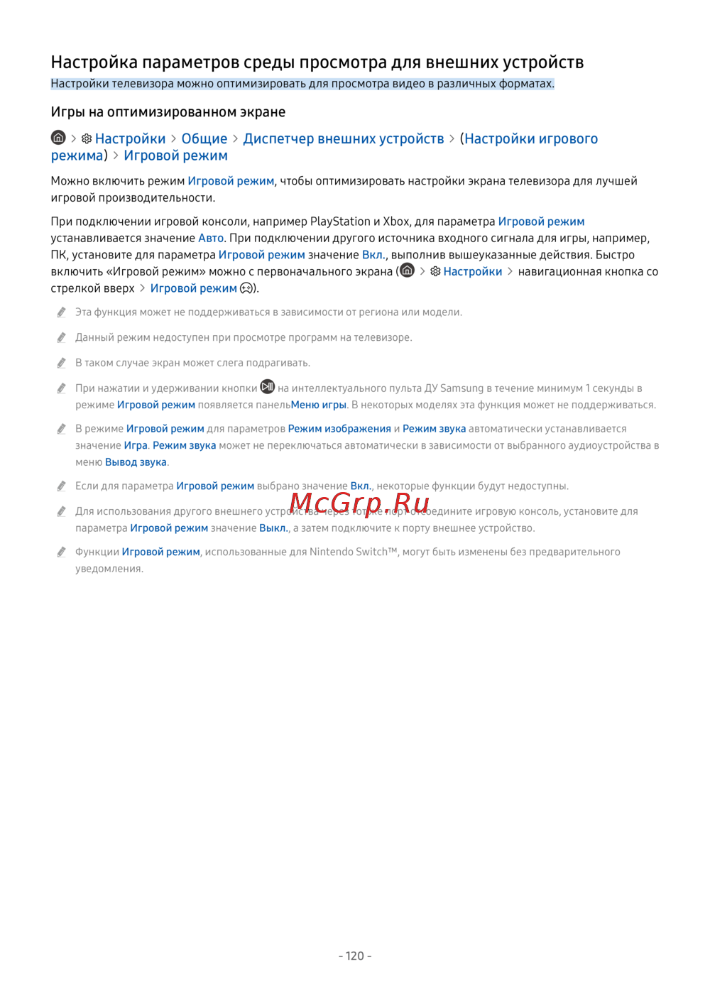 ![Samsung UE65AU7500U [120/264] При подключении игровой консоли например playstation и xbox для параметра игровой режим устанавливается значение авто при подключении другого источника входного сигнала для игры например пк установите для параметра игровой режим значение вкл выполнив вышеуказанные действия быстро включить игровой режим можно с первоначального экрана настройки навигационная кнопка со стрелкой вверх игровой режим](/views2/2016749/page120/bg78.png)