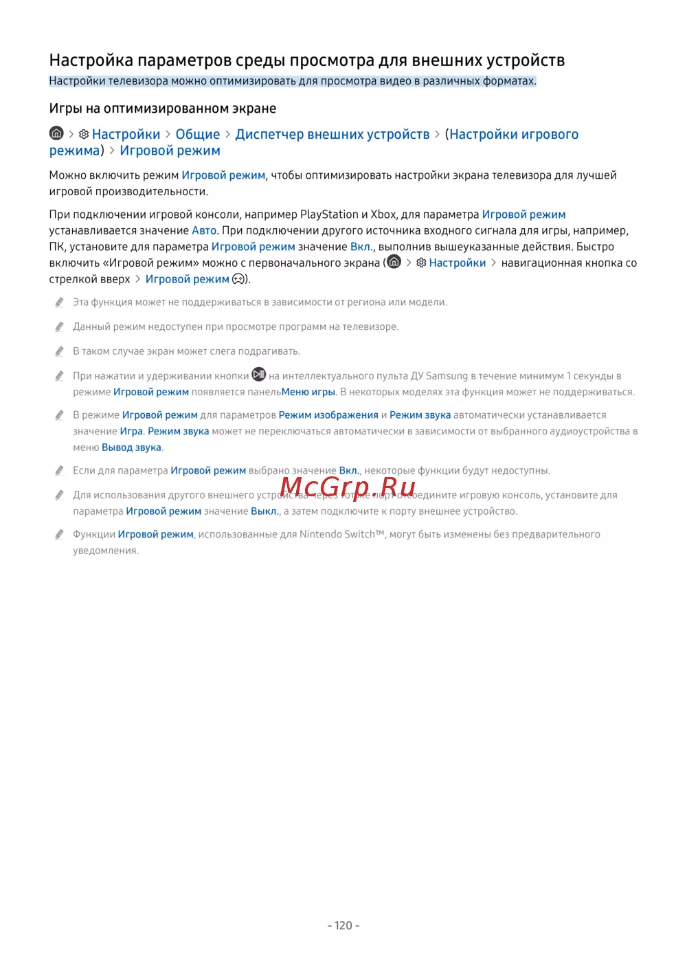 При подключении игровой консоли, например PlayStation и Xbox, для параметра Игровой режим