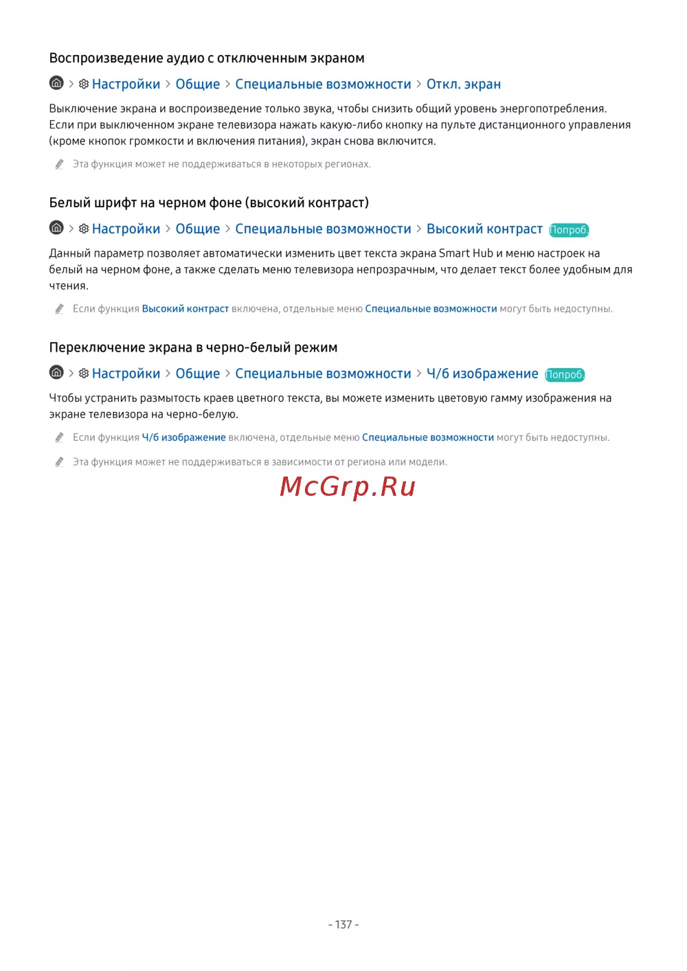 Если функция Ч/б изображение включена, отдельные меню Специальные возможности могут быть недоступны.