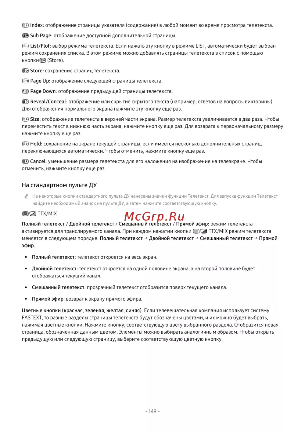 На некоторые кнопки стандартного пульта ДУ нанесены значки функции Телетекст. Для запуска функции Телетекст