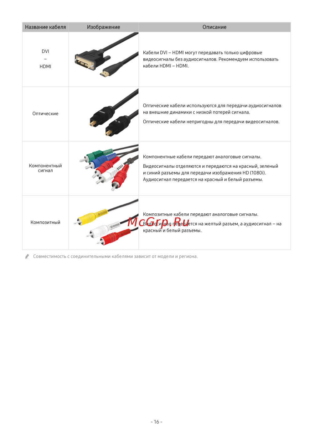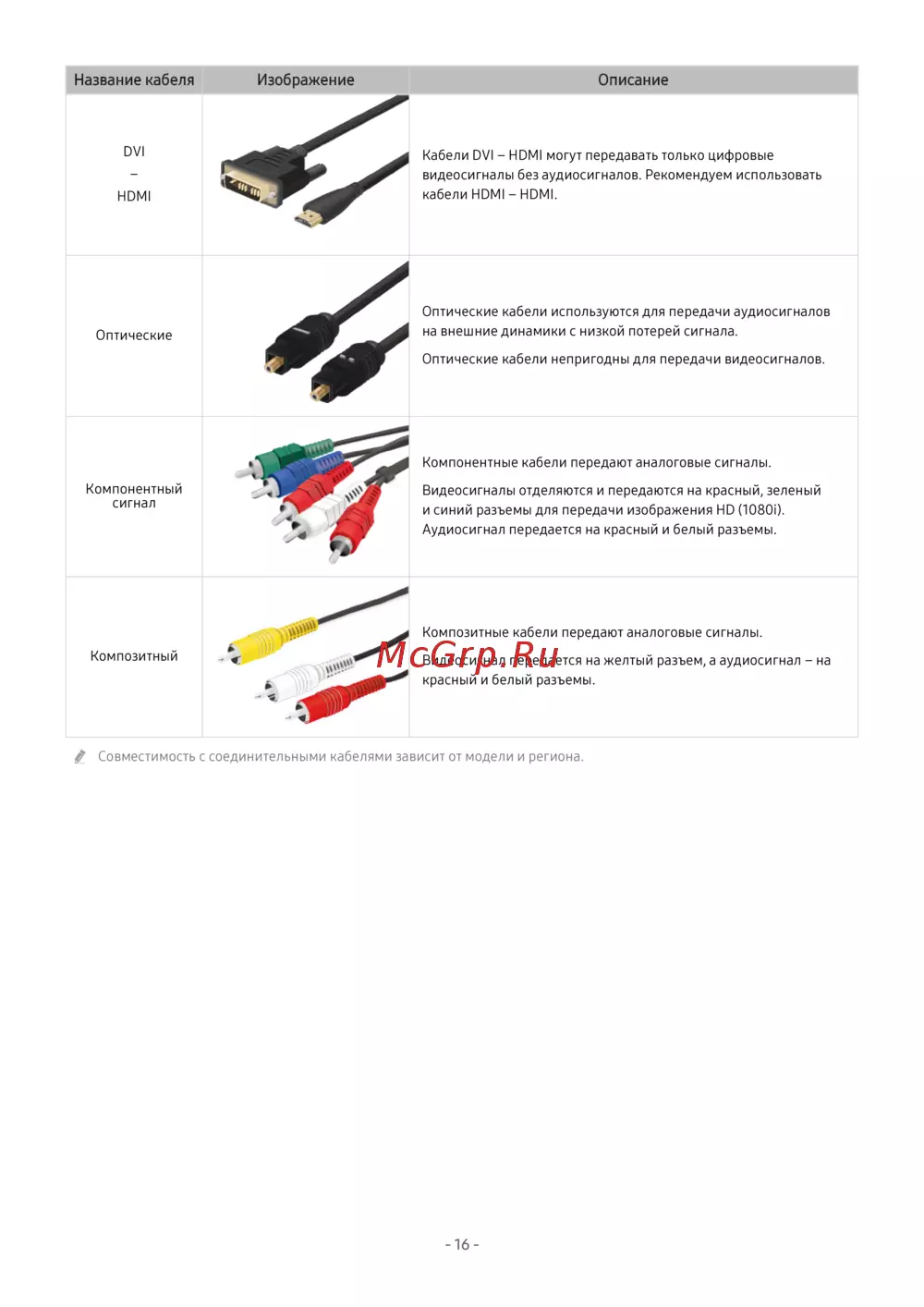 - В этом разделе можно ознакомиться с подробными сведениями о кабелях для подключения внешних устройств совместимых с телевизором p.15