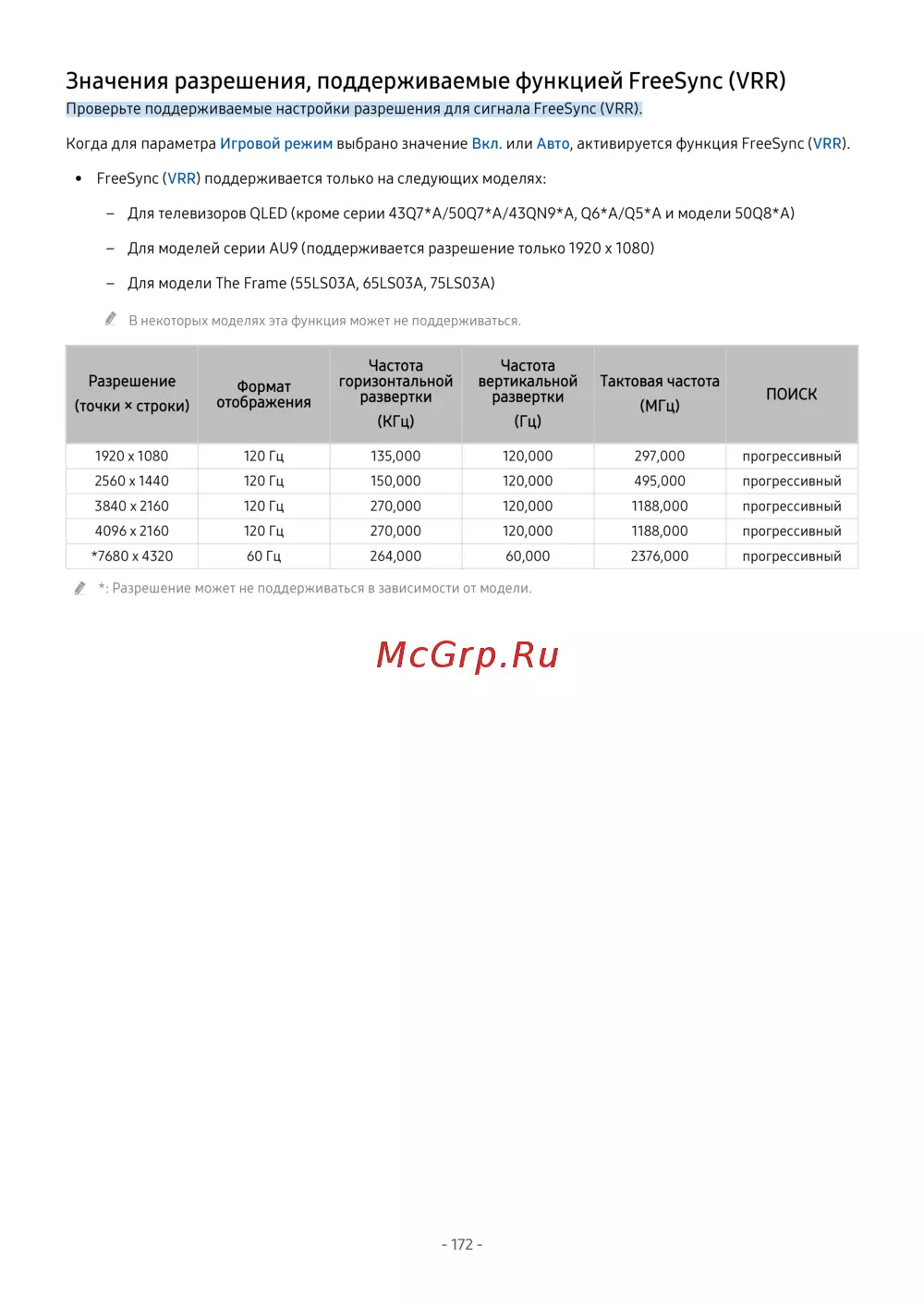 Samsung UE65AU7500U [172/264] Значения разрешения поддерживаемые функцией freesync vrr