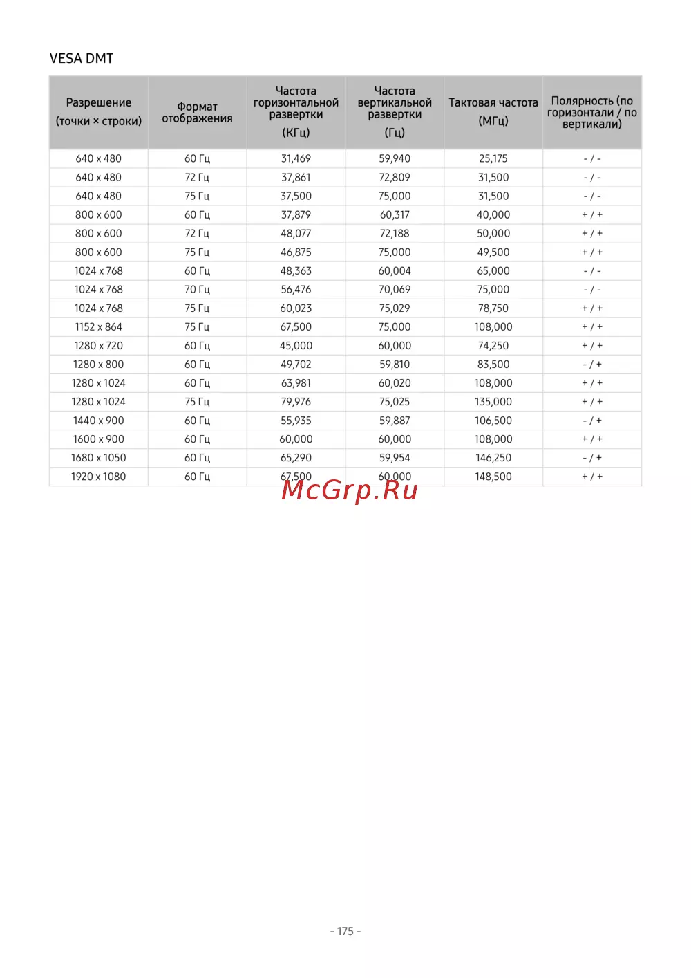 640 x 480 60 Гц 31,469 59,940 25,175 - / -
