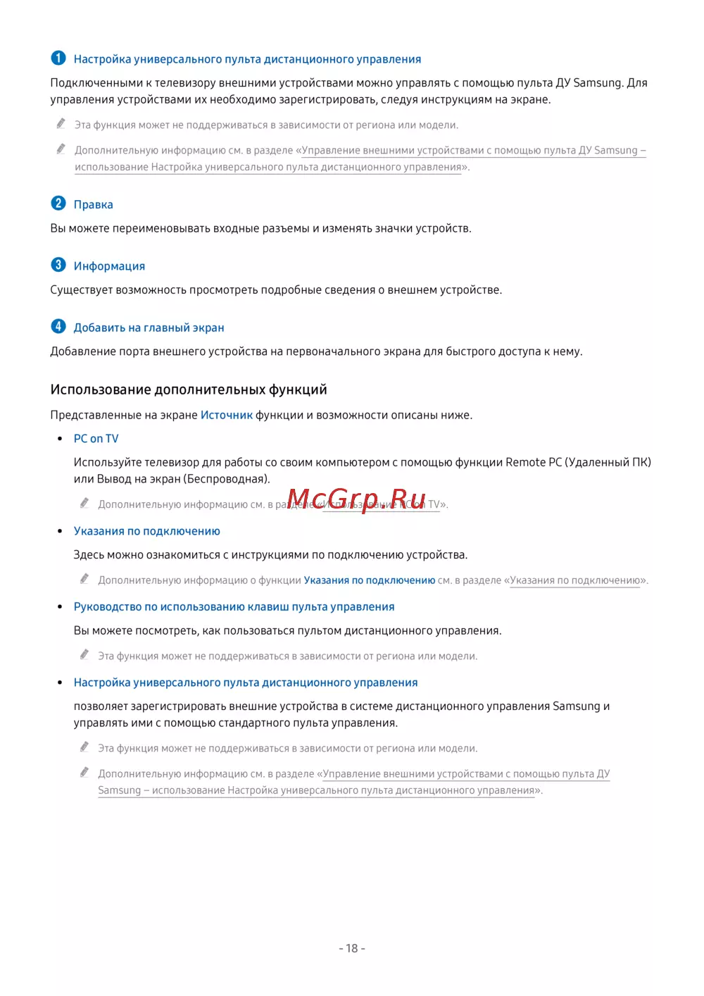 Подключенными к телевизору внешними устройствами можно управлять с помощью пульта ДУ Samsung. Для