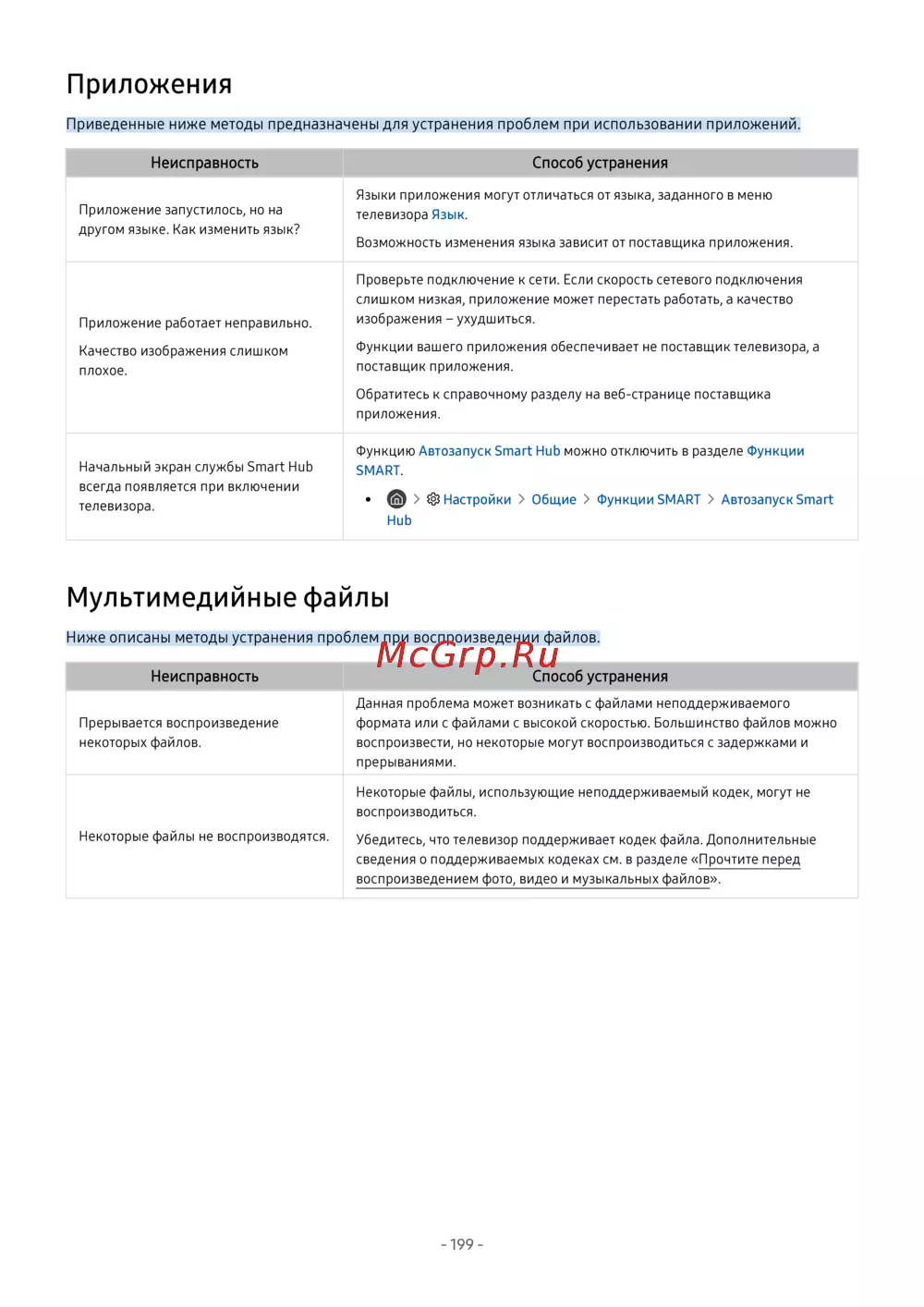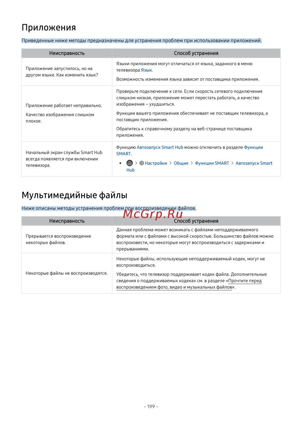 - Вы можете диагностировать проблемы в работе телевизора и службы smart hub и пользоваться функциями восстановления p.203
