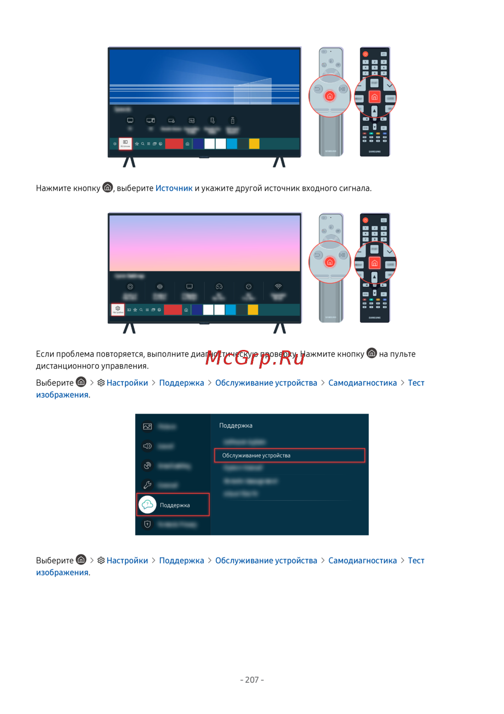 - Вы можете диагностировать проблемы в работе телевизора и службы smart hub и пользоваться функциями восстановления p.203