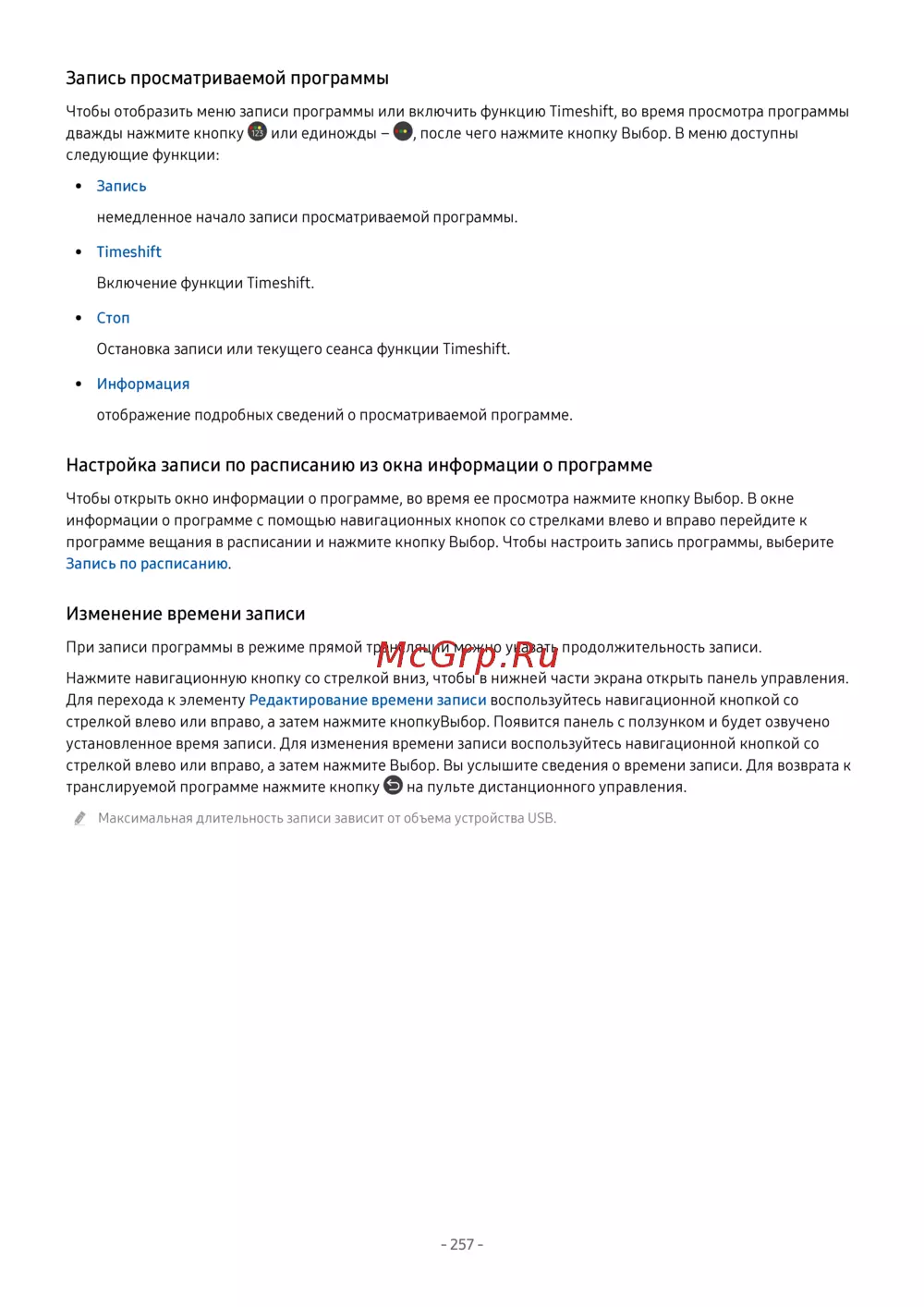 - Использование функций моментальной записи и записи по расписанию на экране телегида p.256