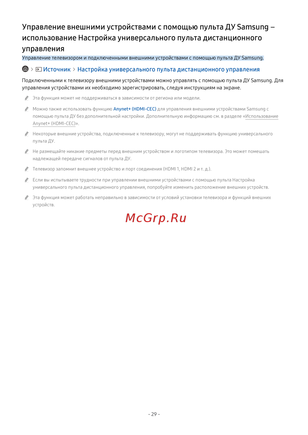 Можно также использовать функцию Anynet+ (HDMI-CEC) для управления внешними устройствами Samsung с