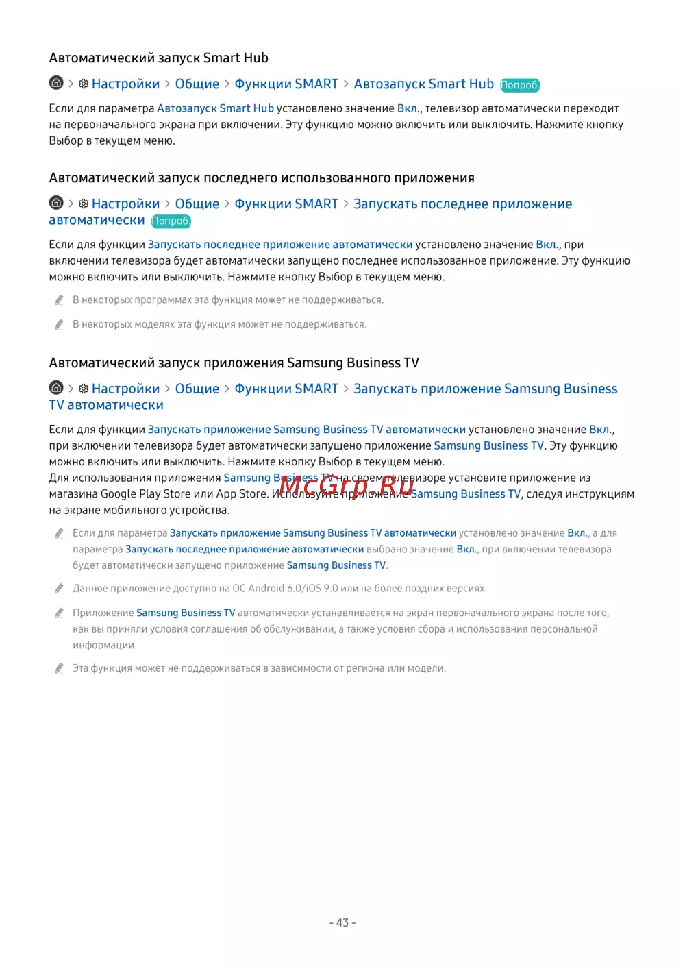 ![Samsung UE65AU7500U [43/264] Настройки общие функции smart запускать приложение samsung business tv автоматически](/views2/2016749/page43/bg2b.png)