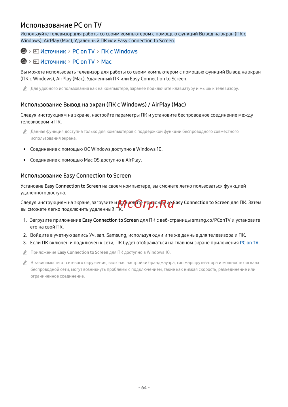 Windows), AirPlay (Mac), Удаленный ПК или Easy Connection to Screen.