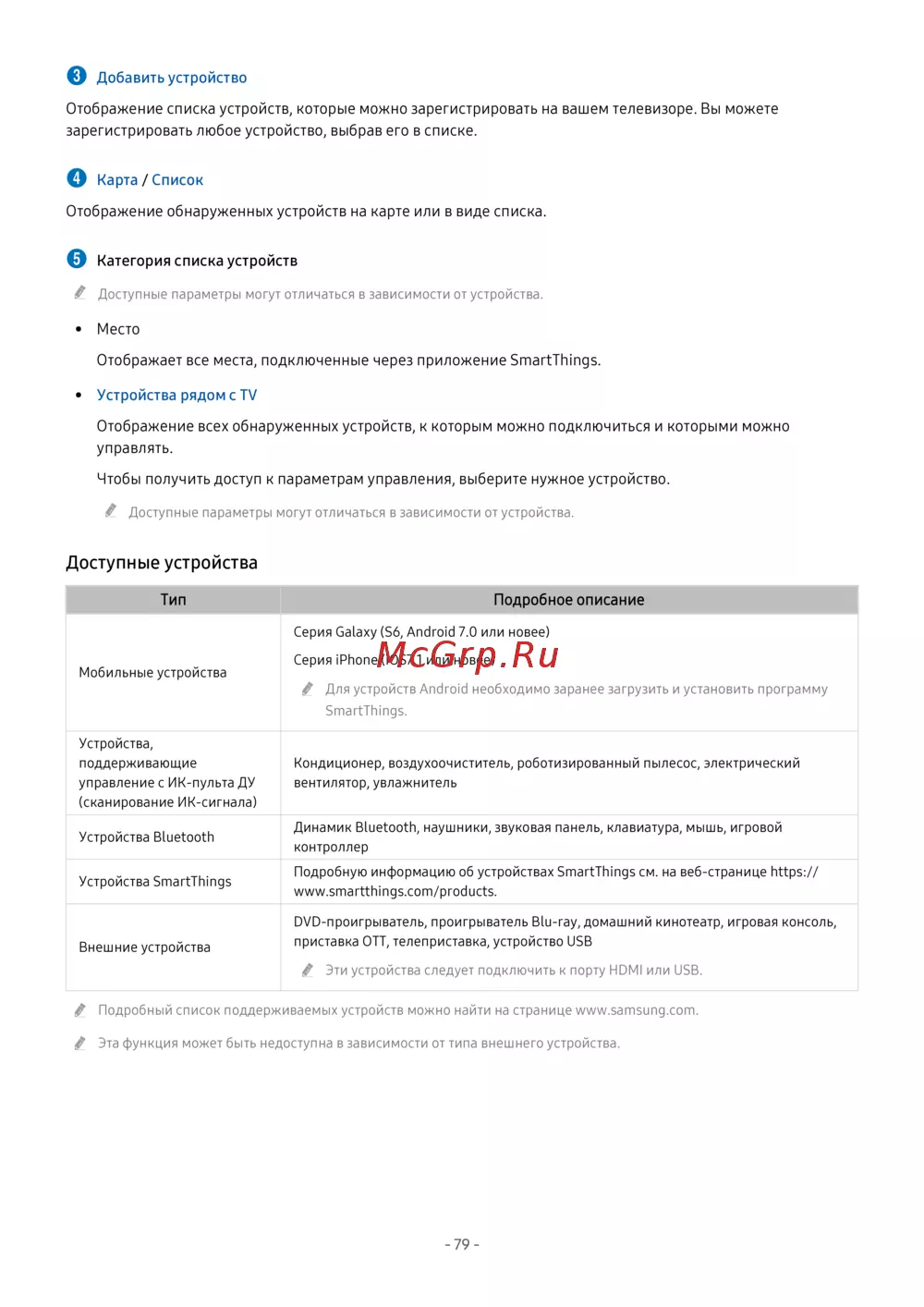 Подробный список поддерживаемых устройств можно найти на странице www.samsung.com.