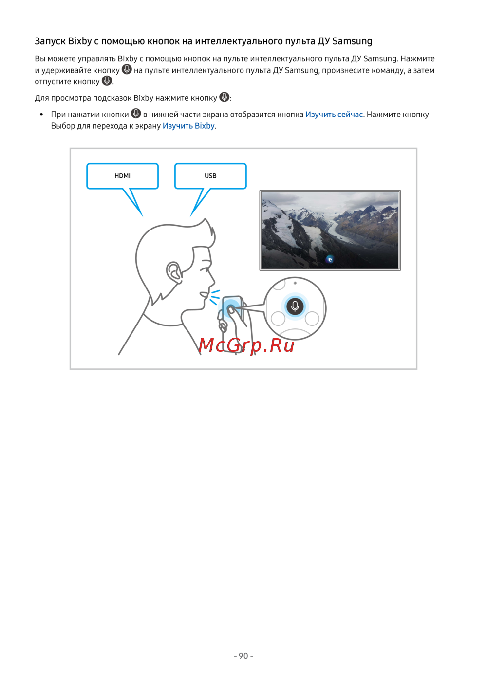 - Чтобы воспользоваться службой bixby нажмите и удерживайте кнопку на интеллектуального пульта ду samsung произнесите команду в микрофон на пульте ду а затем отпустите кнопку чтобы запустить bixby p.264