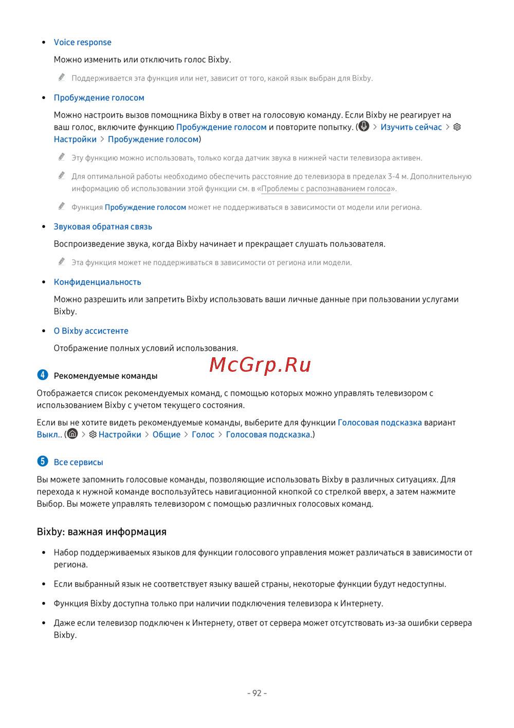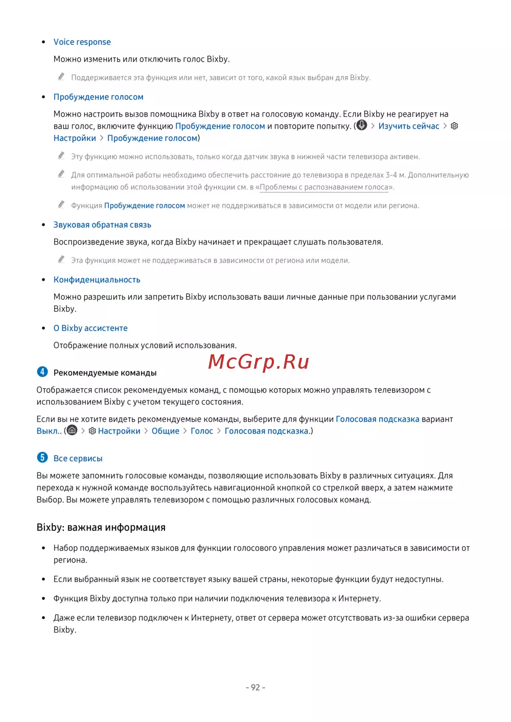 - Для использования функции bixby телевизор должен быть подключен в интернету кроме того вам понадобится микрофон на пульте интеллектуального пульта ду samsung p.264