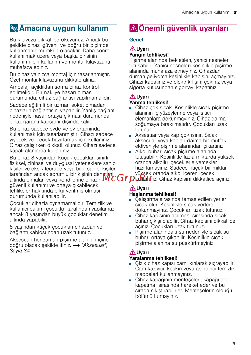 tutuşabilir. Yanıcı nesneleri kesinlikle pişirme