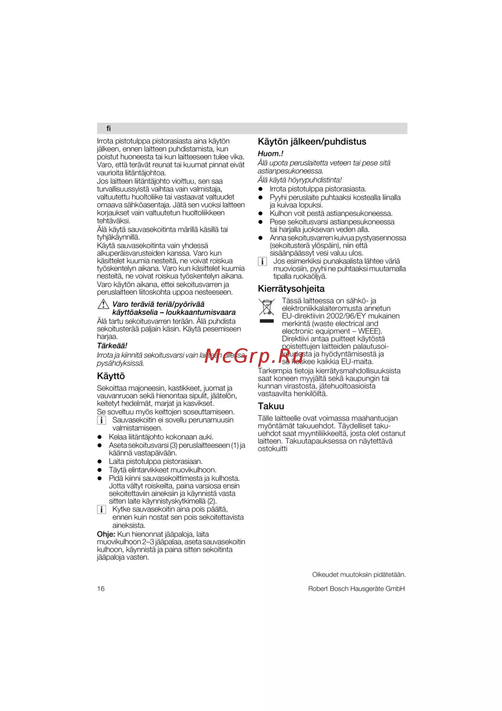 fi Irrota pistotulppa pistorasiasta aina käytön jälkeen ennen laitteen puhdistamista kun poistut huoneesta tai kun laitteeseen tulee vika Varo että terävät reunat tai kuumat pinnat eivät vaurioita lütäntäjohtoa Jos laitteen I iitäntäjohto vioittuu sen saa tun allisuussyistä vaihtaa vain valmistaja valtuutettu huoltoliike tai vastaavat valtuudet omaavasähköasentaja Jätäsen vuoksi laitteen korjaukset vain valtuutetun huoltolükkeen tehtäväksi Ää käytä sauvasekoitinta märillä käsillä tai tyhjäkäynnillä Käytä sauvasekoitinta vain yhdessä alkuperäisvarusteiden kanssa Varo kun käsittelet kuumia nesteitä ne voivat roiskua työskentelyn aikana Varo kun käsittelet kuumia nesteitä ne voivat roiskua työskentelyn aikana Varo käytön aikana ettei sekoitusvarren ja peruslaitteen liitoskohta uppoa nesteeseen Varo teräviä teriä pyörivää käyttöakselia loukkaantumisvaara Ää tartu sekoitusvarren terään Älä puhdista sekoitusterää paljain käsin Käytä pesemiseen harjaa Tärkeää Irrota ja kiinnitä ækoitusvarsi vain laitteen ollessa pysähdyksissä Käyttö Sekoittaa majoneesin kastikkeet juomat ja vauvanruoan sekä hienontaa sipulit jäätelön keitetyt hedelmät marjat ja kasvikset Se soveltuu myös keittojen soseuttamiseen T Sauvasekoitin ei sovellu perunamuusin valmistamiseen Kelaa liitäntäjohto kokonaan auki Aseta sekoitusvarsi 3 peruslaitteeseen 1 ja käännä vastapäivään Laita pistotulppa pistorasiaan Täytä elintarvikkeet muovikulhoon Pidä kiinni sauvasekoittimesta ja kulhosta Jotta vältyt roiskeilta paina varsiosa ensin sekoitettaviin aineksiin ja käynnistä vasta Sitten laite käynnistyskytkimellä 2 T Kytke sauvasekoitin aina pois päältä ennen kuin nostat sen pois sekoitettavista aineksista Ohje Kun hienonnat jääpaloja laita muovikulhoon 2 3jääpalaa aseta sauvasekoitin kulhoon käynnistä ja paina Sitten sekoitinta jääpaloja vasten Kayton jalkeen puhdistus Huom l Ala upota peruslaitetta veteen tai pese sita astianpesukoneessa Ala kayta hoyrypuhdistinta Irrota pistotulppa pistorasiasta Pyyhi peruslaite puhtaaksi kostealla liinalla ja kuivaa lopuksi Kulhon voit pesta astianpesukoneessa Pese sekoitusvarsi astianpesukoneessa tai harjalla juoksevan veden alia Anna sekoitusvarren kui vua pystyasennossa sekoitustera ylospain niin etta sisaanpaassyt vesi valuu ulos Jos esimerkiksi punakaalista lahtee varia muoviosiin pyyhi ne puhtaaksi muutamalla tipalla ruokaoljya Kierratysohjeita VgK Tassa laitteessa on sahko ja PM elektroniikkalaiteromusta annetun EU direktiivin 2002 96 EY mukainen merkinta waste electrical and electronic equipment WEEE Direktiivi antaa puitteet kaytosta poistettujen laitteiden palautusoikeudesta ja hyodyntamisesta ja se koskee kaikkia EU maita Tarkempia tietoja kierratysmahdollisuuksista saat koneen myyjalta seka kaupungin tai kunnan virastosta jatehuoltoasioista vastaavilta henkilbilta Takuu Talle laitteelle ovat voimassa maahantuojan myontamat takuuehdot Taydelliset takuuehdot saat myynti II ikkeelta josta olet ostanut laitteen Takuutapauksessa on naytettava ostokuitti Oikeudet muutoksiin pidätetään 16 Robert Bosch Hausgeräte GmbH