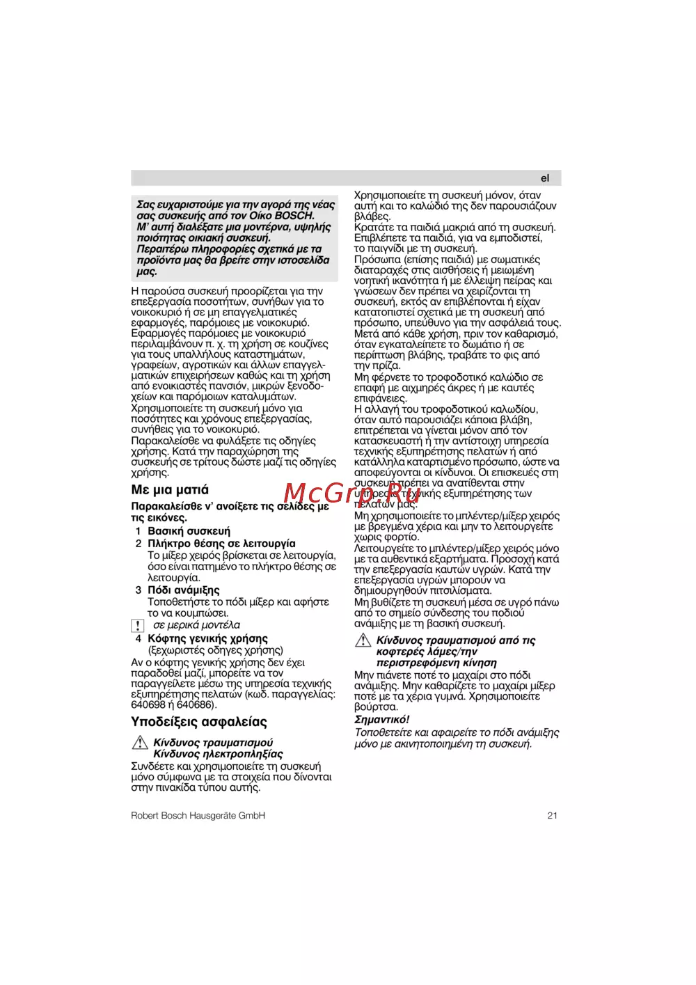 el Zaq EuxapiaroúpE yia Tqv ayopá rqq véaq aaq auoKEuqq anó TOV OÍKO BOSCH M aurq õiaAÉÇarE pia povrépva uipqAqq noiÓTqraç oiKiaxq auoKEuq Пора тёры nAqpotpopÍEq OXETIKÓ ps та npoióvra paq ва ßpEtTE arqv IOTOOEAIÔO paq H napoúaa оиокеир npoopíÇerai yia TT V ene epyaaia поаотптшу auvr 0œv yia то voiKOKupió f as рп enayyeXpariKéç ефарроуеп napópoieç pe voiKOKupió Ефарроуеп napópoieç pe voiKOKupió nepiXapßävouv п X тп ХРПОП O Kou íveç yia TOUÇ unaXXf Xouç катаатпратшу урафе шу ауропкшу KOI àXXœv enayyeXpaTiKcóv enixeipnoetûv KaOcóç KOI ТП XPnoq anó evoiKiaaréç navaióv piKpcóv ÇevoõoXeícov Kai napôpoiœv катаХирагшу XpnaiponoieÍTe тп аиакеип póvo yia пооотптес Kai xpóvouç eneçepyaaíaç auvr 0eiç уюто voiKOKupió ПаракаХе а0е va фиХ0 ете TIÇ oônyíeç ХРПОПР Kará TT V паррхшрпап тип ouoKeunç oeTpiTouç бшате paÇÍTiç oônyíeç ХРПСПК Mc pia paná napaKoAeíaOe v avoí eTe TIÇ ackíòEq pe eiKÓveç 1 BaaiKq аиакеип 2 ПЛпкгро 0éoqç ae AeiTOupyía TIÇ To píÇep xeipóç ßpiaKeTai ae Xerroupyía óao eivai narnpévo то пЛпктро 0éanç ae Xerroupyía 3 nóôi avápi nÇ Топо0етпоте то nóõt píÇep KOI афпоте то va Koupnœaei Jj as pspiKá povréAa Xpnaiponoierre тп аиакеип póvov órav аитп KOI то каХшою TT Ç õev napouaiáÇouv ßXäßeq Kparáre та naiõiá ракрю anó тп аиакеип EnißXenere та naiõiá yia va epnoõioreí то naiyviöi ре тп аиакеип Проашпа eníanç naiõiá ре aœpaTiKéç ôiarapaxéç anç aio0r aeiç n peiœpévn vorjriKií iKavÔTHTa п ре ЁХЛегфп neipaç Kai yvœaecûv õev npénei va x ipí ovrai тп аиакеип SKTÓC av enißXenovrai n eíxav кататопюте OXCTIKÓ ре тп аиакеип anó npôaœno uneú0uvo yia TT V aaipáXeiá TOUÇ Мет0 anó KÓ0e ХРП п npiv TOV кабарюро ÓTav еукатаХе пете то õwpáno n ae nepirrrœan ßXáßпç TpaßäreTO ipiç anó TT V npíÇa Mn ipépveTe то тросробопко каХшбю ae епафп pe aixpnpéç ÓKpeç п pe Kauréç en áveieç H aXXayñ тои трофоботгкоО KOXCÚÕÍOU ÓTav auTÓ napouaiá ei KÓnoia ßX0ßn eniTpéneTai va yíveTai póvov anó TOV катаакеиаотп n TT V avríaroixn unnpeaía TexyiKnç eÇunnpÉTnanç neXarcóv ñ anó KaráXXnXa катарпареуо npôaœno шоте va апофеОуоута oí KÍVOUVOI Oi enioKeuéç отп аиакеип npénei va avarí0evrai OTHV unnpeaía Texviraíç eÇunnpéTnanç ТШУ neXarcóv paç Мп хрпацлопо еаето pnXévrep pí epxeipóç pe ßpeypeva x P a Kai pnv то Хеггоируесге Xœpiç фортю Леггоируегге то pnXévTep píÇep X lPÓÇ póvo ре та au0evTiKá е артпрата Прооохп кат0 TT v eneÇepyaaía каитшу uypcíiv Kará ТПУ ene epyaaía uypcóv pnopouv va ônpioupyn0oûv niToiXíapaTa Mn ßuOi ereTn аиакеип péoa ae uypó nàvœ anó то onpeío aúvõeanç тои noõioú avápiÇnç P ТП ßaaiKii аиакеип 4 Kóфтпç yeviKqç ХРПСТПЧ Çexœpicrréç oônyeç xPÓanq Av o кофтрр yeviKiíç xpnonç õev xei napaõo0eí pa í pnopeÍTe VOTOV napayyeíXeTe реаштпп unnpeaíaTexviKnç е илпретпапп neXaróv кшб napayyeXíaç 640698 n 640686 Mnv niáveTe поте то paxaípi ото nóõi avápi nç Mqv кабар етето paxaípi pí ep поте ре та x P a yupva Xpnaiponoierre ßoüpraa YnoSeíÇciç aacpaAcíaç ZqpavTiKÓ í Kívõuvoq TpaupaTiapoú TonoQsrsÍTS Kai aipaipsírs то nóõt avápiÇqq póvo ps OKivqTonoiqpévq тг au ОКЕ up í Kívõuvoq TpaupaTiapoú anó Tiq KocpTEpéq AápEq Tqv nEpiarpsipópEvq KÍvqaq Kívõuvoq qAEKTponAq íaq Euvôéere KOI xpnatpono á8 тп аиакеип póvo аирфшуа ре та crroixeía пои öivovrai оглу nivaKiöa TÚnou OUTIÍÇ Robert Bosch Hausgeräte GmbH 21