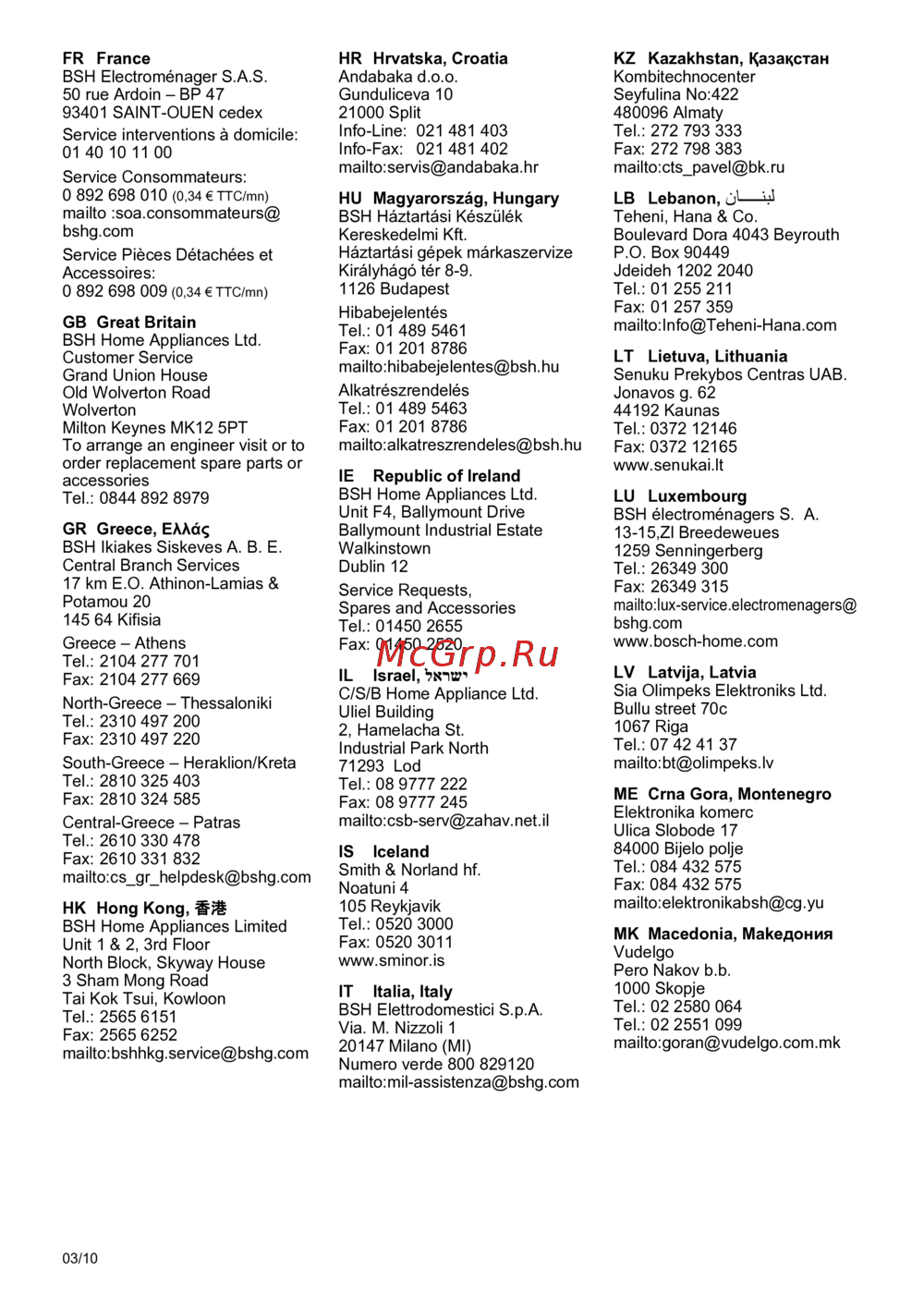 FR France HR Hrvatska Croatia KZ Kazakhstan Казахстан BSH Electroménager S A S 50 rue Ardoin BP 47 93401 SAINT OUEN cedex Andabaka d o o Gunduliceva 10 21000 Split Info Line 021 481 403 Info Fax 021 481 402 mailto servis andabaka hr Kombi technocenter Seyfolina No 422 480096 Almaty Tel 272 793 333 Fax 272 798 383 mailto cts_pavel bk ru Service interventions à domicile 01 40 10 11 00 Service Consommateurs 0 892 698 010 O Î4 TTC mn mailto soa consommateurs bshg com Service Pièces Détachées et Accessoires 0 892 698 009 0 34 TTC mn G B Great Britain BSH Home Appliances Ltd Customer Service Grand Union House Old Wolverton Road Wolverton Milton Keynes MK12 5PT To arrange an engineer visit or to order replacement spare parts or accessories Tel 0844 892 8979 GR Greece EXÀàç BSH Ikiakes Siskeves A B E Central Branch Services 17 km E O Athinon Lamias Potamou 20 145 64 Kifisia Greece Athens Tel 2104 277 701 Fax 2104 277 669 North Greece Thessaloniki Tel 2310 497 200 Fax 2310 497 220 South Greece Heraklion Kreta Tel 2810 325 403 Fax 2810 324 585 Central Greece Patras Tel 2610 330 478 Fax 2610331 832 mailto cs_gr_helpdesk bshg com HK Hong Kong BSH Home Appliances Limited Unit 1 2 3rd Floor North Block Skyway House 3 Sham Mong Road Tai Kok Tsui Kowloon Tel 2565 6151 Fax 2565 6252 mailto bshhkg service bshg com 03 10 HU Magyarorszag Hungary LB Lebanon J BSH Haztartasi KeszLilek Kereskedelmi Kft Haztartasi gepek markaszervize Kiralyhago ter 8 9 1126 Budapest Teheni Hana Co Boulevard Dora 4043 Beyrouth P O Box 90449 Jdeideh 1202 2040 Tel 01 255 211 Fax 01 257 359 mailto lnfo Teheni Hana com Hibabejelentes Tel 01 489 5461 Fax 01 201 8786 mailto hibabejelentes bsh hu Alkatreszrendeles Tel 01 489 5463 Fax 01 201 8786 mailto alkatreszrendeles bsh hu IE Republic of Ireland BSH Home Appliances Ltd Unit F4 Ballymount Drive Ballymount Industrial Estate Walkins town Dublin 12 Service Requests Spares and Accessories Tel 01450 2655 Fax 01450 2520 LT Lietuva Lithuania Senuku Prekybos Centras UAB Jonavos g 62 44192 Kaunas Tel 0372 12146 Fax 0372 12165 www senukai lt LU Luxembourg BSH électroménagers S A 13 15 Z Breedeweues 1259 Senningerberg Tel 26349 300 Fax 26349 315 mailto lux service electromenagers bshg com www bosch home com IL Israel bs w LV Latvija Latvia C S B Home Appliance Ltd Uliel Building 2 Hamelacha SL Industrial Park North 71293 Lod Tel 08 9777 222 Fax 08 9777 245 mailto csb serv zahav neLil Sia Olimpeks Elektroniks Ltd Bullu street 70c 1067 Riga Tel 07 42 41 37 mailto bt olimpeks lv IS Iceland Smith Norland hi Noatuni 4 105 Reykjavik Tel 0520 3000 Fax 0520 3011 www sminor is IT Italia Italy BSH Elettrodomestici S p A Via M Nizzoli 1 20147 Milano Ml Numero verde 800 829120 mailto mil assistenza bshg com ME Crna Gora Montenegro Elektronika komerc Ulica Slobode 17 84000 Bijelo polje Tel 084 432 575 Fax 084 432 575 mailto elektronikabsh cg yu MK Macedonia Македония Vudelgo Pero Nakov b b 1000 Skopje Tel 02 2580 064 Tel 02 2551 099 mailto goran vudelgo com mk