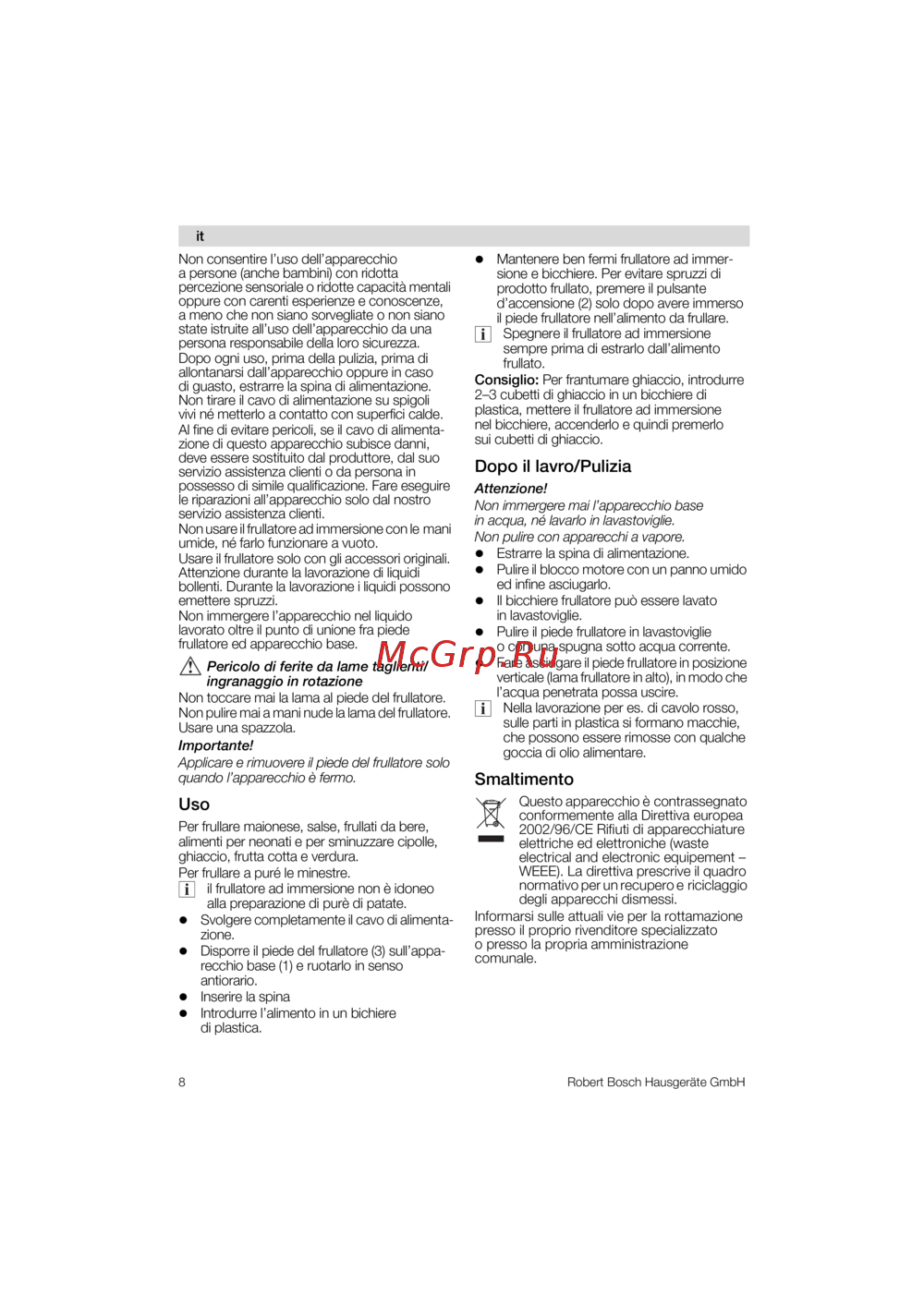 it Non consentire l uso deH apparecchio a persone anche bambini con ridotta percezione sensoriale o ridotte capacità mentali oppure con carenti esperienze e conoscenze a meno che non siano son egliate o non siano state istruite all uso deH apparecchio da una persona responsabile della loro sicurezza Dopo ogni uso prima della pulizia prima di allontanarsi dall apparecchio oppure in caso di guasto estrarre la spina di alimentazione Non tirare il cavo di alimentazione su spigoli vivi né metterlo a contatto con superici calde Al fine di evitare pericoli se il cavo di alimenta zione di questo apparecchio subisce danni deve essere sostituito dal produttore dal suo servizio assistenza clienti o da persona in possesso di simile qualificazione Fare eseguire le riparazioni all apparecchio solo dal nostro servizio assistenza clienti Non usare il frullatore ad immersione con le mani umide né farlo funzionare a vuoto Usare il frullatore solo con gli accessori originali Attenzione durante la lavorazione di liquidi bollenti Durante la lavorazione I liquidi possono emettere spruzzi Non immergere l apparecchio nel liquido lavorato oltre il punto di unione fra piede frullatore ed apparecchio base j Pericolo di ferite da lame taglienti ingranaggio in rotazione Non toccare mai la lama al piede del frullatore Non pulire mai a mani nude la lama del frullatore Usare una spazzola Importante Applicare e rimuovere il piede del frullatore solo quando l apparecchio è fermo Uso Per frullare maionese salse frullati da bere alimenti per neonati e per sminuzzare cipolle ghiaccio frutta cotta e verdura Per frullare a purè le minestre i i il frullatore ad immersione non è idoneo alla preparazione di purè di patate Svolgere completamente il cavo di alimenta zione Disporre il piede del frullatore 3 sull appa recchio base 1 e ruotarlo in senso antiorario Inserire la spina Introdurre l alimento in un bichiere di plastica 8 Mantenere ben fermi frullatore ad immer sione e bicchiere Per evitare spruzzi di prodotto frullato premere il pulsante d accensione 2 solo dopo avere immerso il piede frullatore nell alimento da frullare m Spegnere il frullatore ad immersione sempre prima di estrarlo dall alimento frullato Consiglio Per frantumare ghiaccio introdurre 2 3 cubetti di ghiaccio in un bicchiere di plastica mettere il frullatore ad immersione nel bicchiere accenderlo e quindi premerlo sui cubetti di ghiaccio Dopo il lavro Pulizia Attenzione Non immergere mai l apparecchio base in acqua né lavarlo in lavastoviglie Non pulire con apparecchi a vapore Estrarre la spina di alimentazione Pulire il blocco motore con un panno umido ed infine asciugarlo Il bicchiere frullatore può essere lavato in lavastoviglie Pulire il piede frullatore in lavastoviglie o con una spugna sotto acqua corrente Fare asciugare il piede frullatore in posizione verticale lama frullatore in alto in modo che l acqua penetrata possa uscire i Nella lavorazione per es di cavolo rosso sulle parti in plastica si formano macchie che possono essere rimosse con qualche goccia di olio alimentare Smaltimento Questo apparecchio è contrassegnato conformemente alla Direttiva europea 2002 96 CE Rifiuti di apparecchiature elettriche ed elettroniche waste electrical and electronic equipement WEEE La direttiva prescrive il quadro normativo per un recupero e riciclaggio degli apparecchi dismessi Informarsi sulle attuali vie per la rottamazione presso il proprio rivenditore specializzato o presso la propria amministrazione comunale Robert Bosch Hausgeräte GmbH