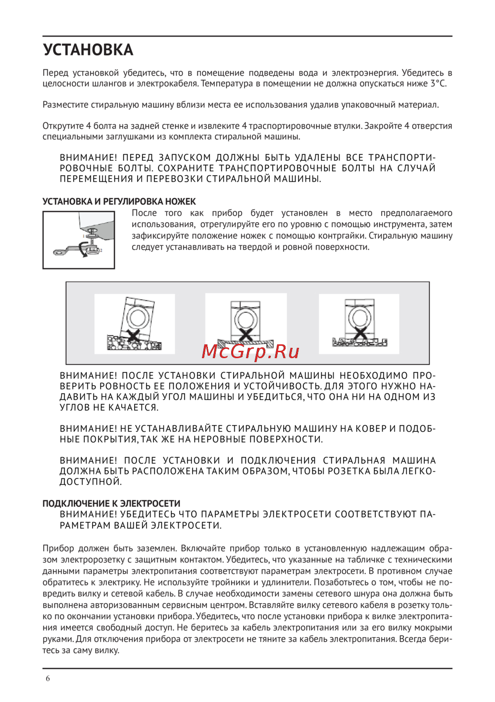 ВНИМАНИЕ! ПОСЛЕ УСТАНОВКИ И ПОДКЛЮЧЕНИЯ СТИРАЛЬНАЯ МАШИНА